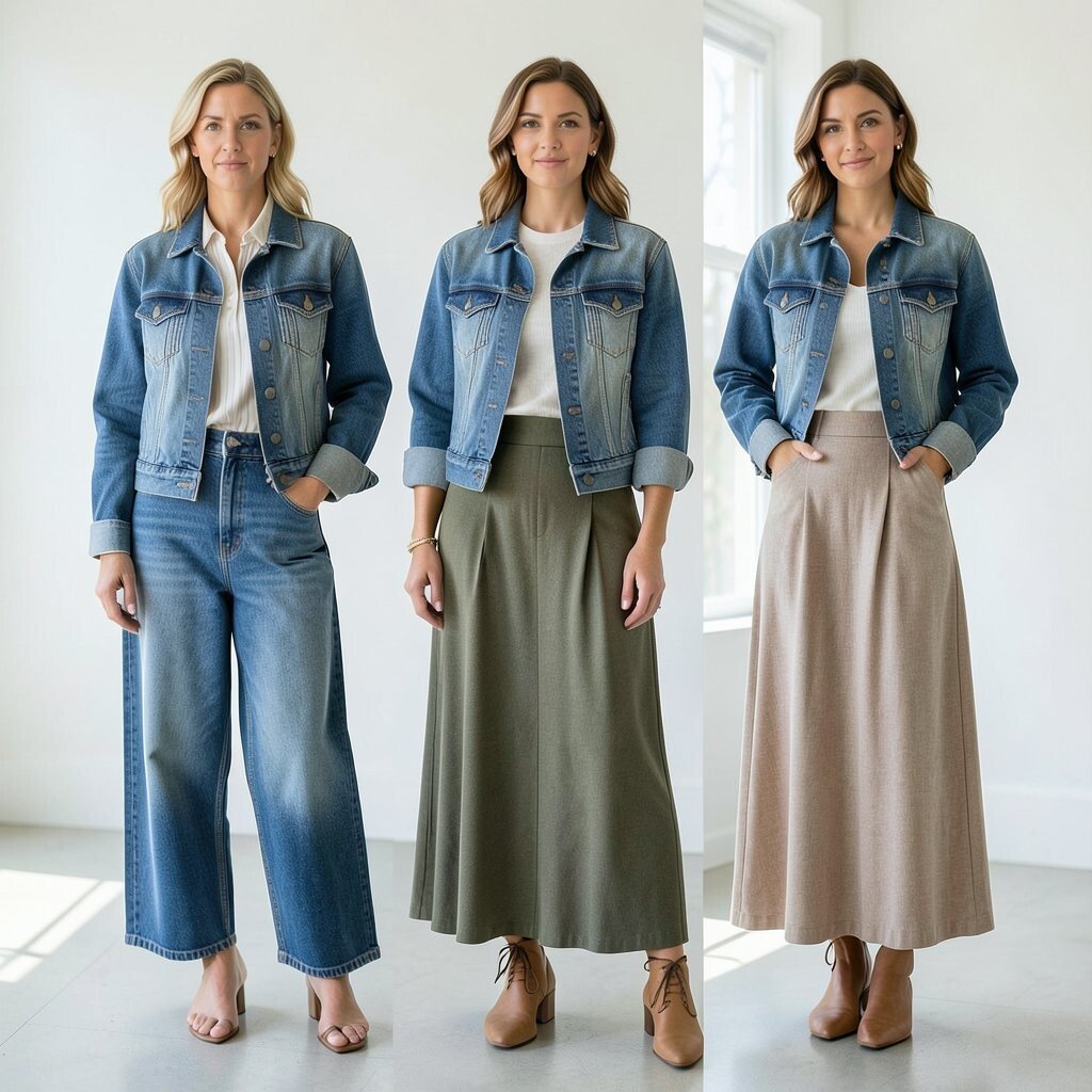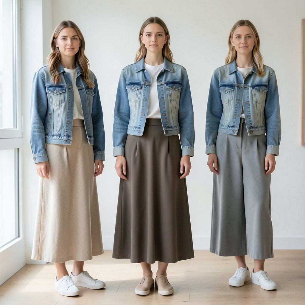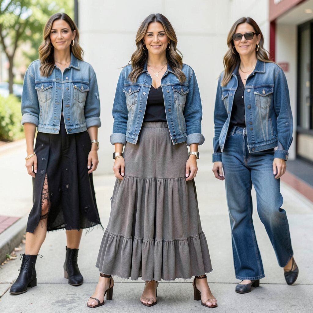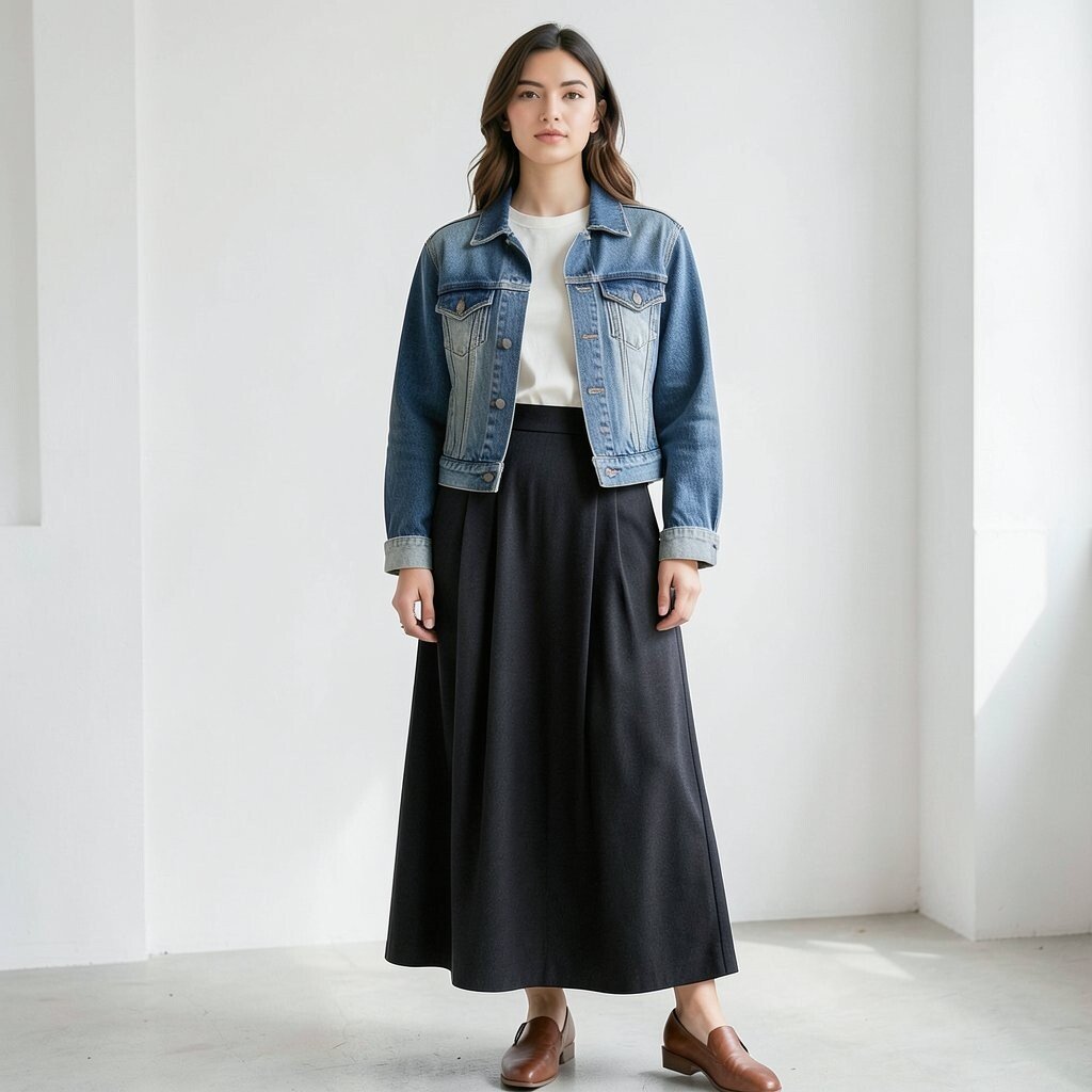 Try a brown or olive maxi skirt with a beige top and a dark denim jacket. The earthy tones create a warm, inviting look that’s perfect for fall. It’s a cozy combination that’s both stylish and comfortable.