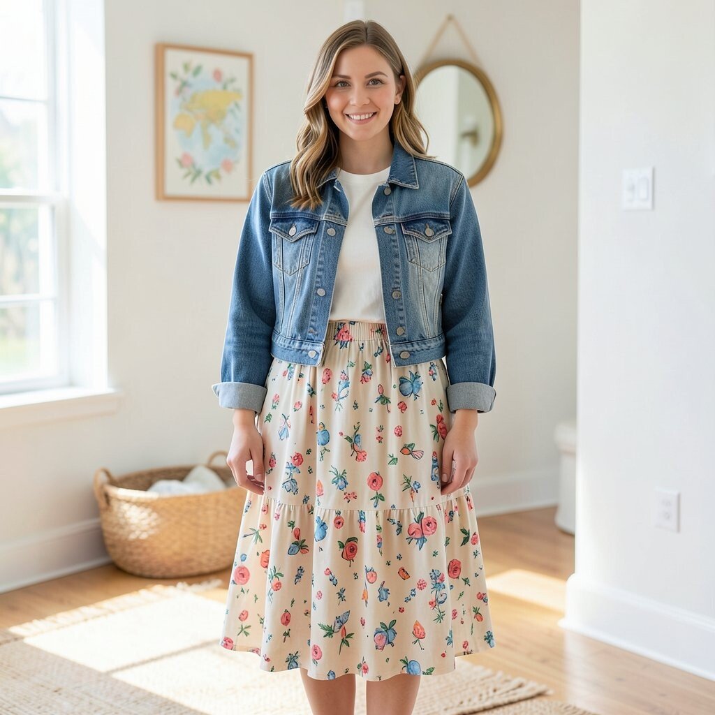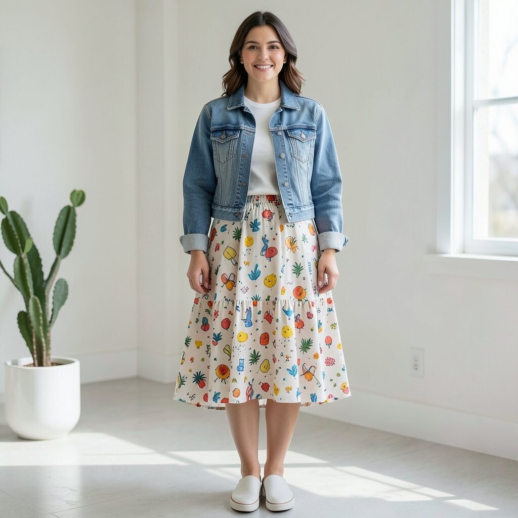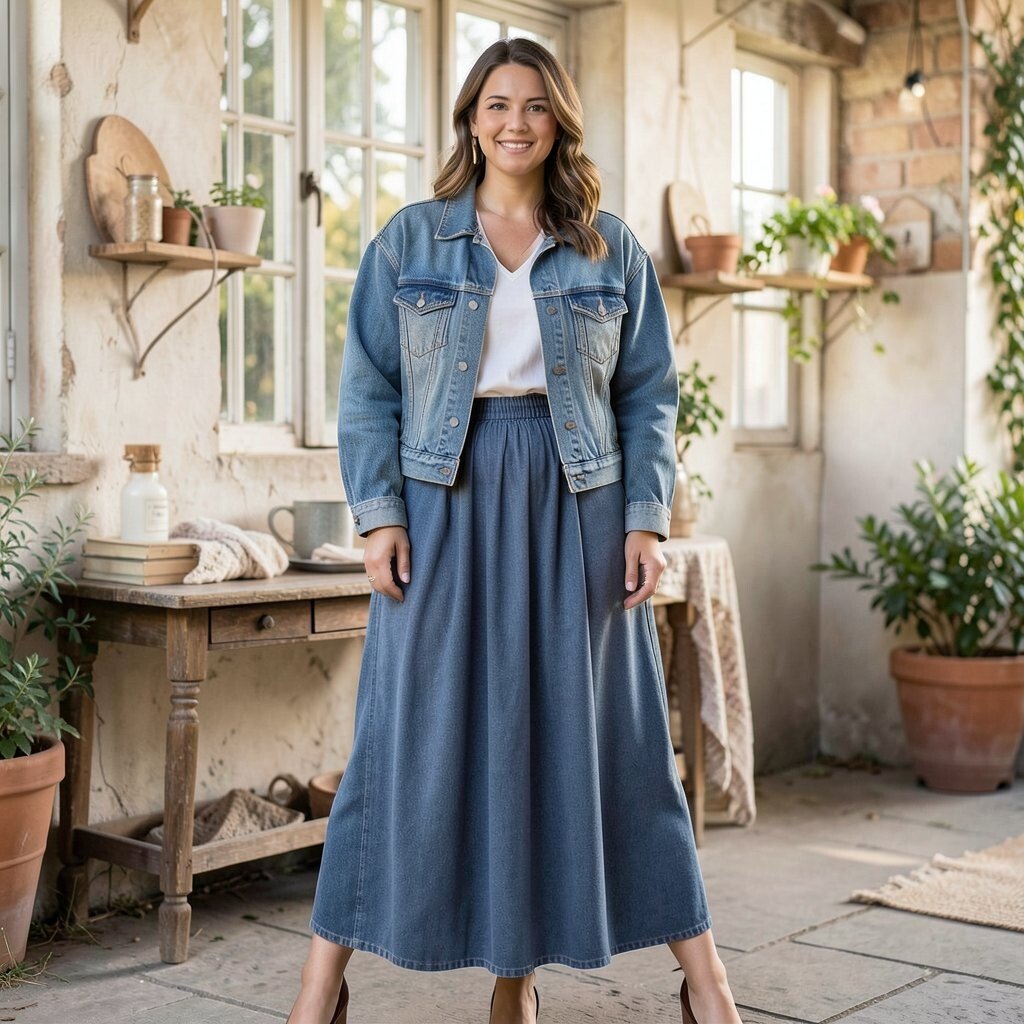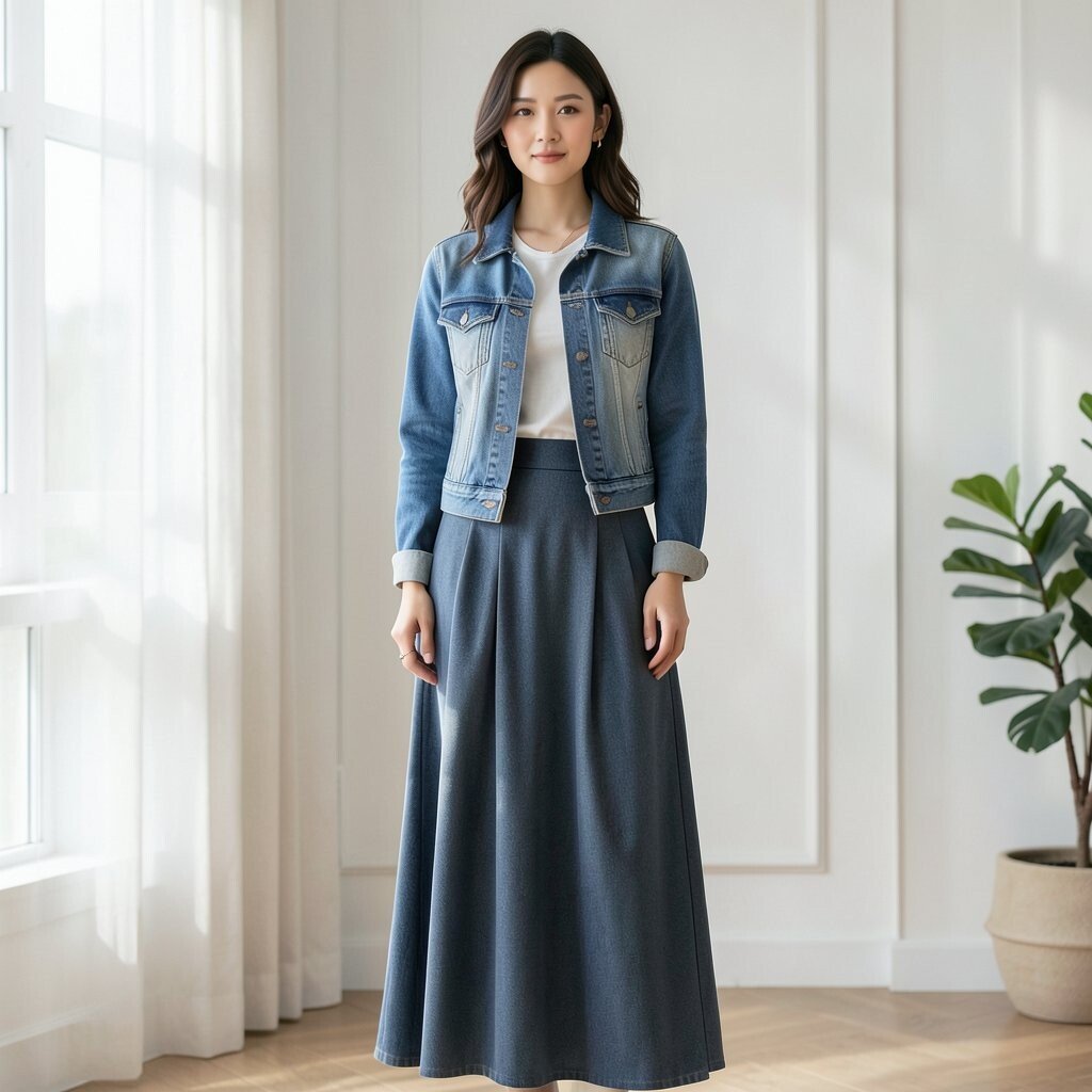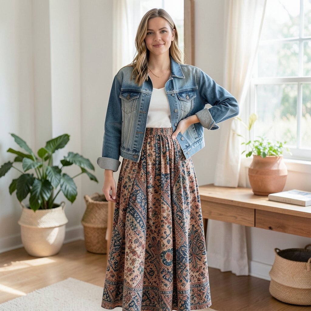 A patterned maxi skirt with a simple top and a denim jacket creates a fun and lively look. The patterns add excitement, while the denim jacket keeps it balanced. It’s a playful style that brings joy to any occasion.