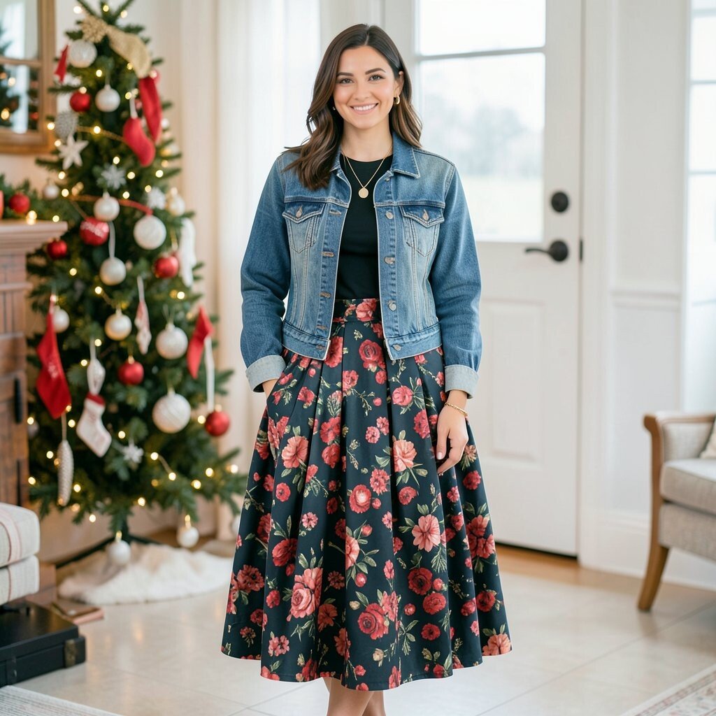 A colorful maxi skirt with a festive top and a light denim jacket is perfect for celebrations. The colors bring energy, while the denim jacket keeps it light. It’s a festive look that’s full of life and joy.