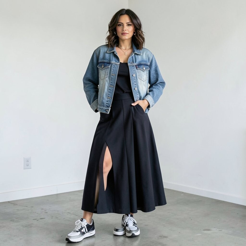 Combine a sporty maxi skirt with a casual tank and a cropped denim jacket for an athletic look. The sporty skirt adds a dynamic element, while the denim jacket keeps it casual. It’s a fun way to blend sporty and chic styles.