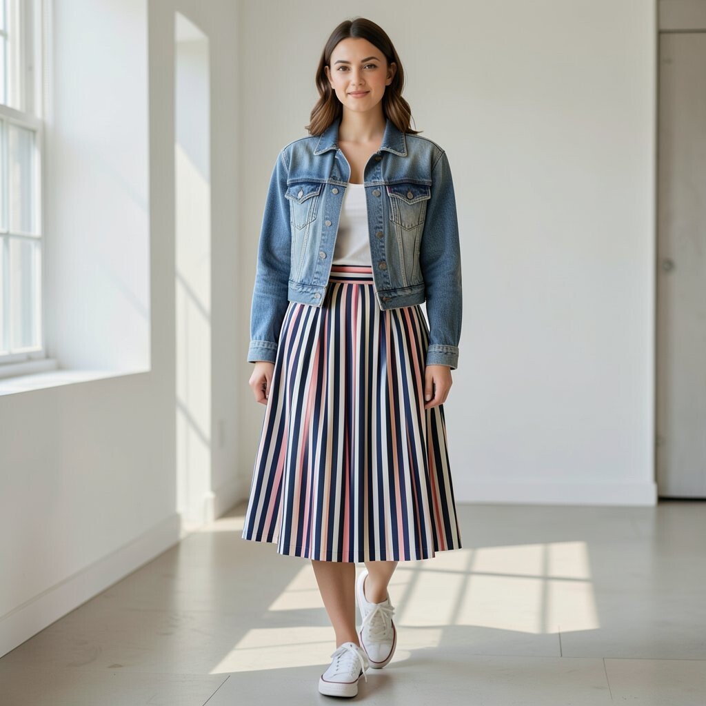 A striped maxi skirt with a contrasting top and a denim jacket creates a bold look. The stripes add energy, while the denim jacket keeps it chic. It’s a powerful look that commands attention.