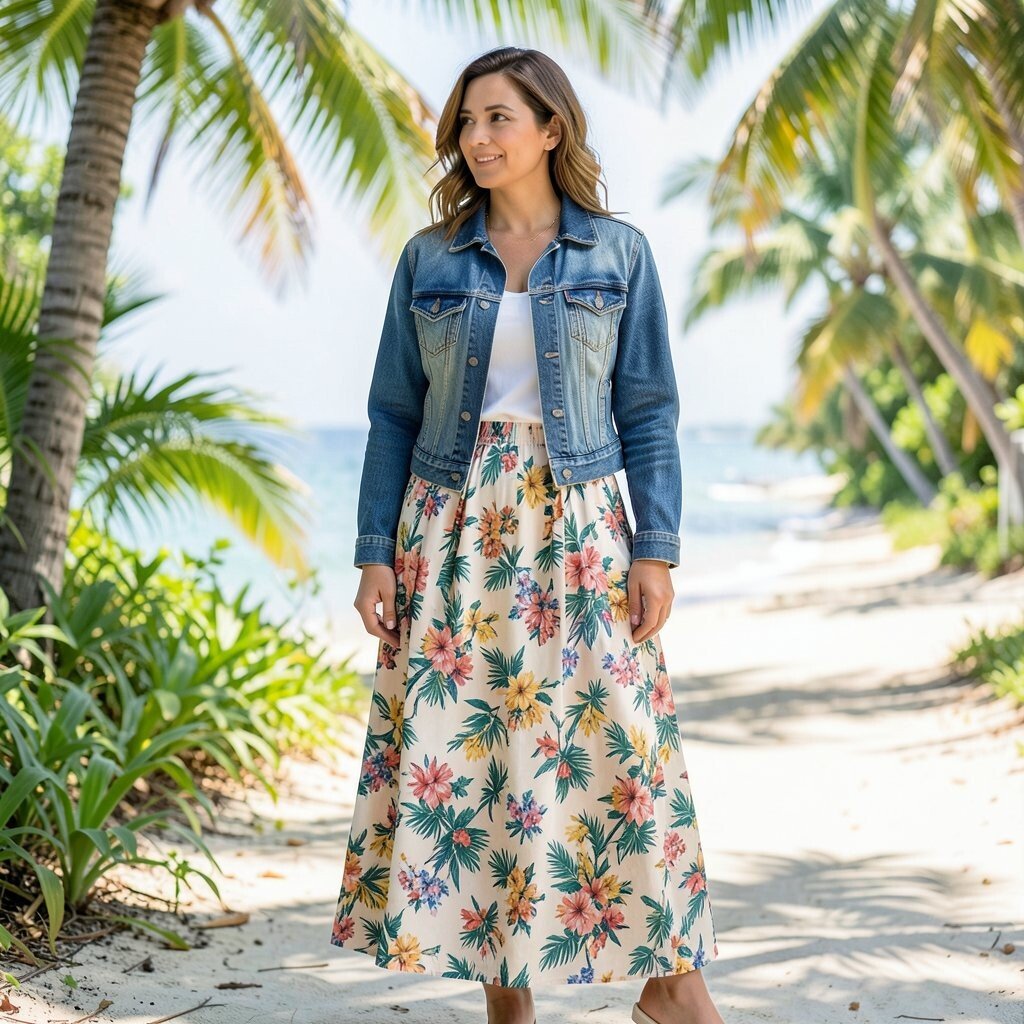 A tropical print maxi skirt with a breezy top and a light denim jacket evokes a vacation vibe. The tropical print is lively, while the denim jacket keeps it casual. It’s a refreshing look that brings the beach to you.