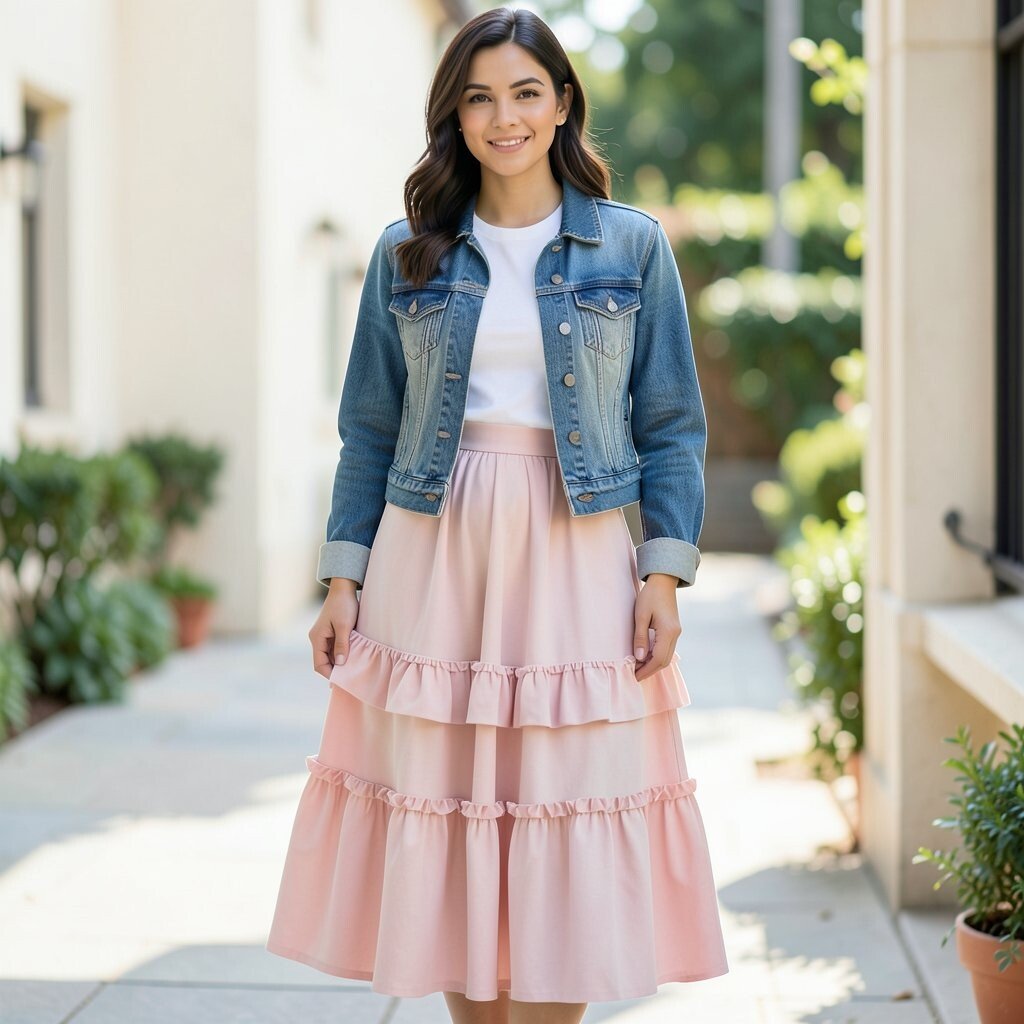 A ruffled maxi skirt with a fitted top and a cropped denim jacket creates a romantic silhouette. The ruffles add a touch of whimsy, while the denim jacket keeps it from being overly sweet. It’s a delightful mix of textures and styles.