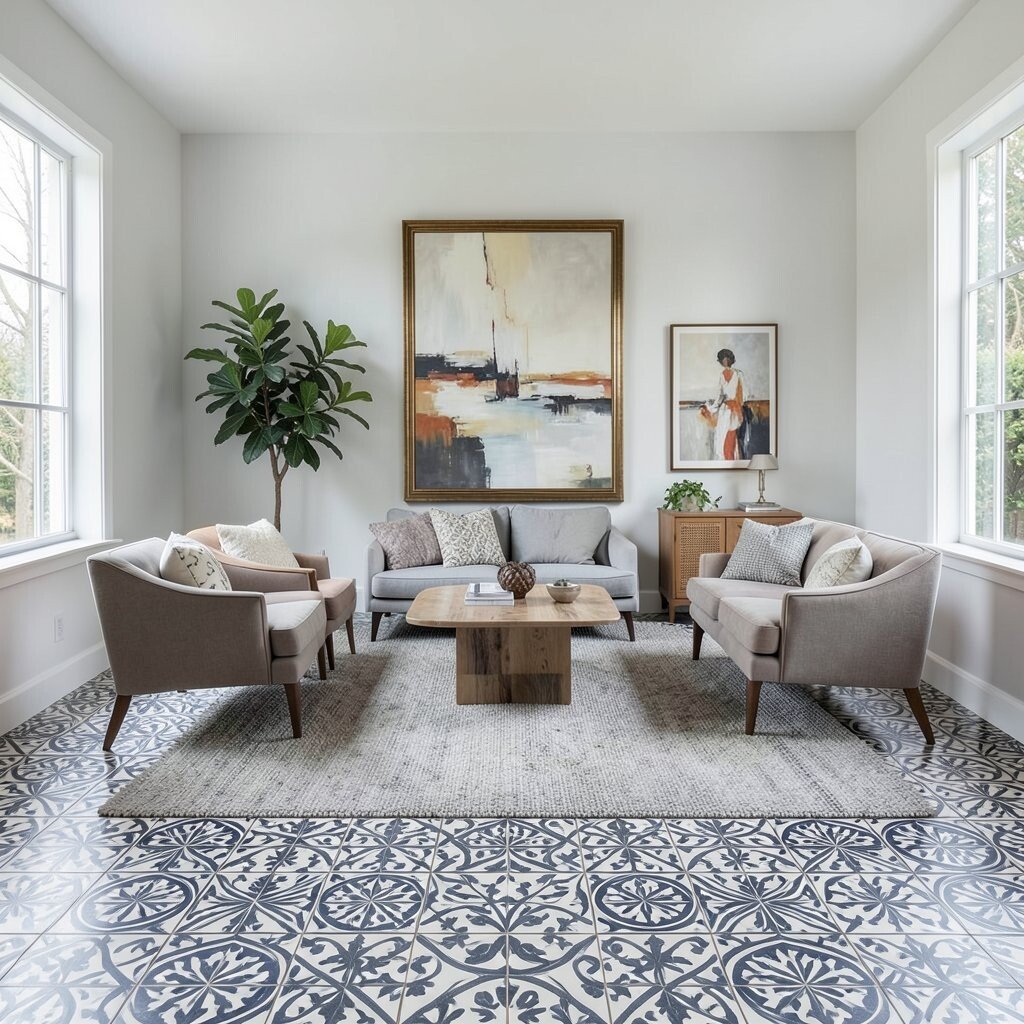 Patterned floors bring a room to life. Tiles with bold designs or painted wood can set the tone.