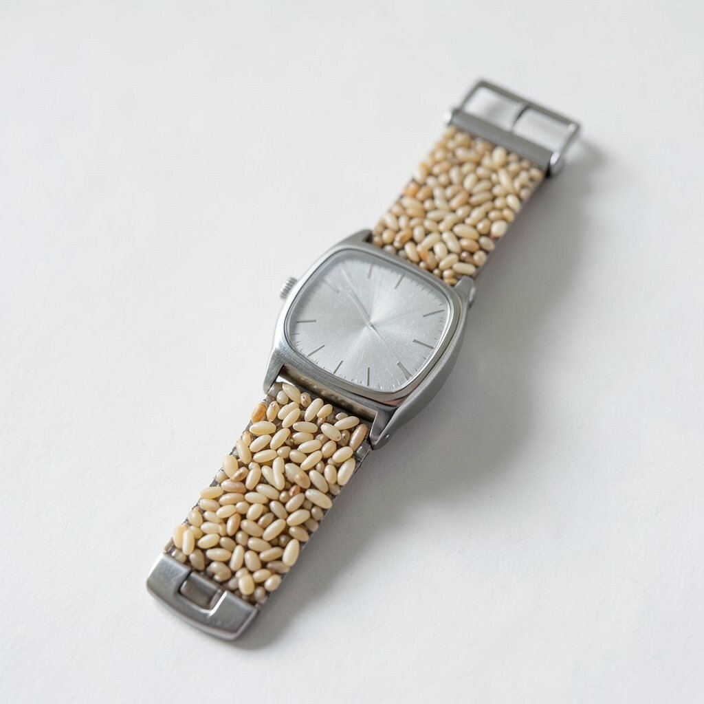 The beads of rice strap is a vintage-inspired design. It features small, rounded links that resemble grains of rice.