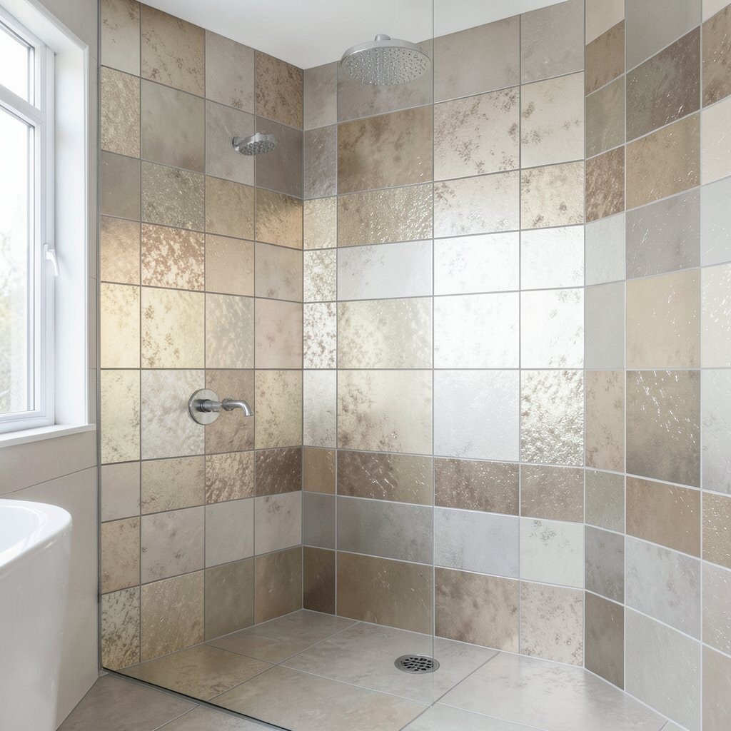Use them around a sink, in a shower strip, or behind a mirror for a small but strong effect. This keeps the room interesting without covering every wall. Costs stay more manageable when you use metallic tiles as accents instead of a full install.