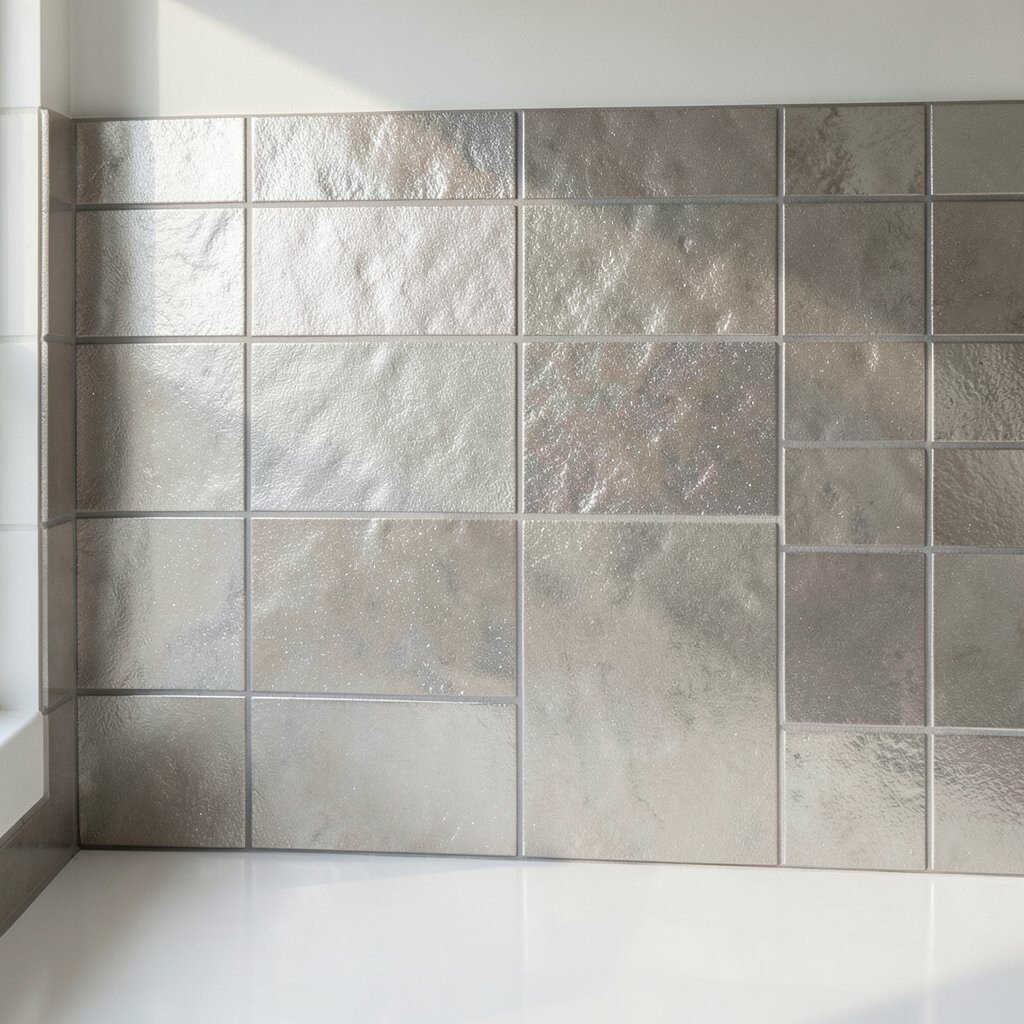 To make the look your own, mix metallic tiles with plain stone or ceramic pieces. This finish is popular now because it adds shine without needing extra decor.