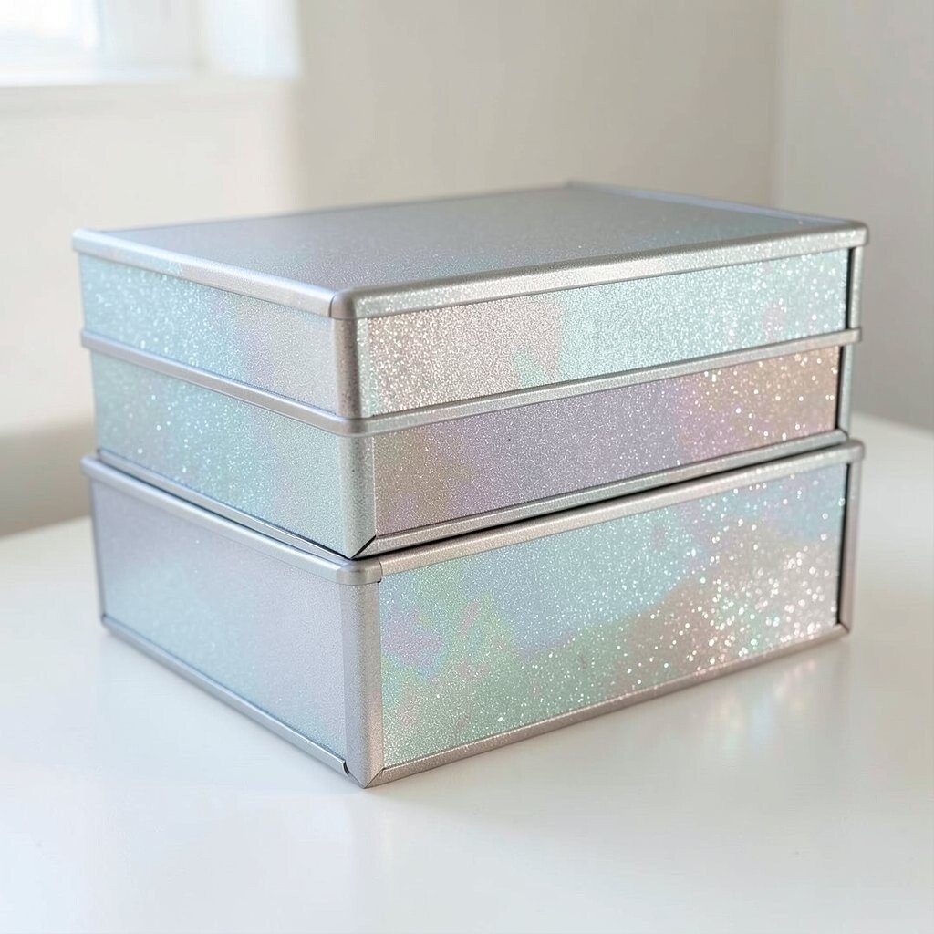 Shimmering storage boxes keep clutter hidden while adding a pretty glow. Their metallic finish can make shelves and desks look neat instead of crowded.