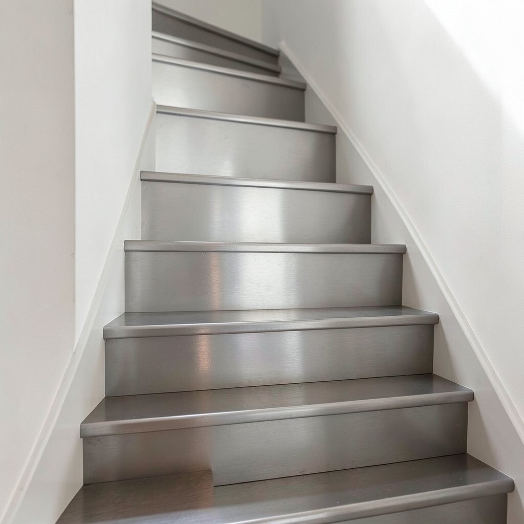 For a personal touch, mix metallic risers with plain steps or patterned runners. This look is especially eye-catching in modern homes and creative spaces.