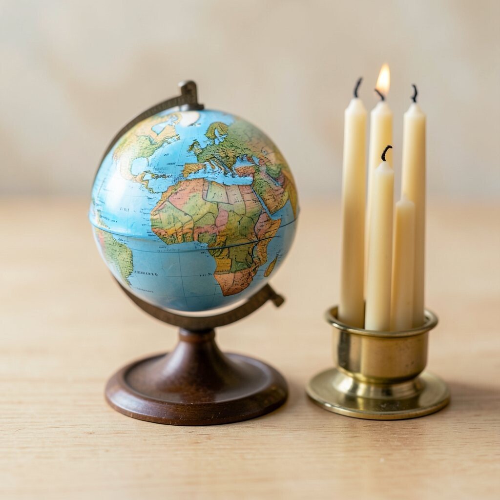 A mini globe beside a candle cluster can make a room feel warm and calm. The round globe and soft candle shapes work well together on a table or shelf.