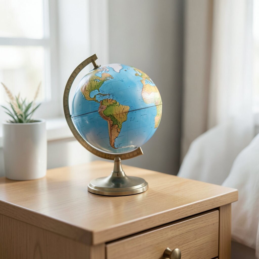 A mini globe on a bedside table brings a soft sense of adventure to a quiet space. It can feel calming to look at before sleep and inspiring when you wake up.