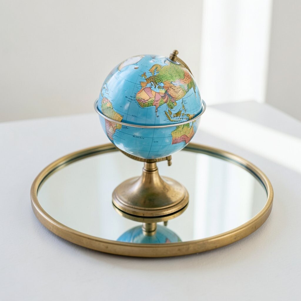 A miniature globe on a mirror tray looks bright and polished. The reflection helps the globe stand out and makes the whole area feel a little more open.