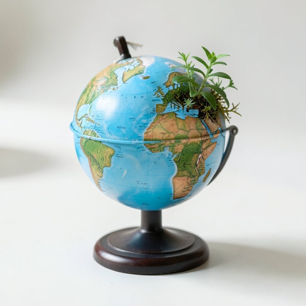 A small globe beside a plant creates a fresh and lively scene. The round globe and leafy plant shapes work together in a way that feels balanced and cheerful.