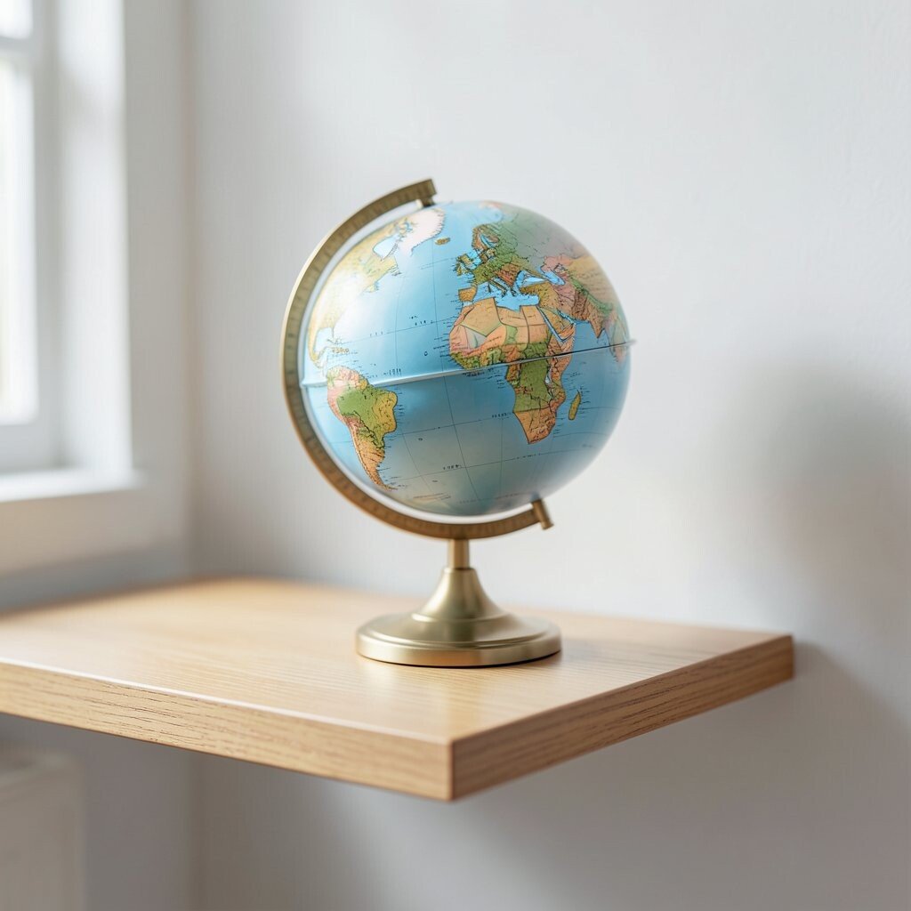 A miniature globe on a floating shelf looks neat and modern. The simple shelf gives the globe room to stand out without needing much space.