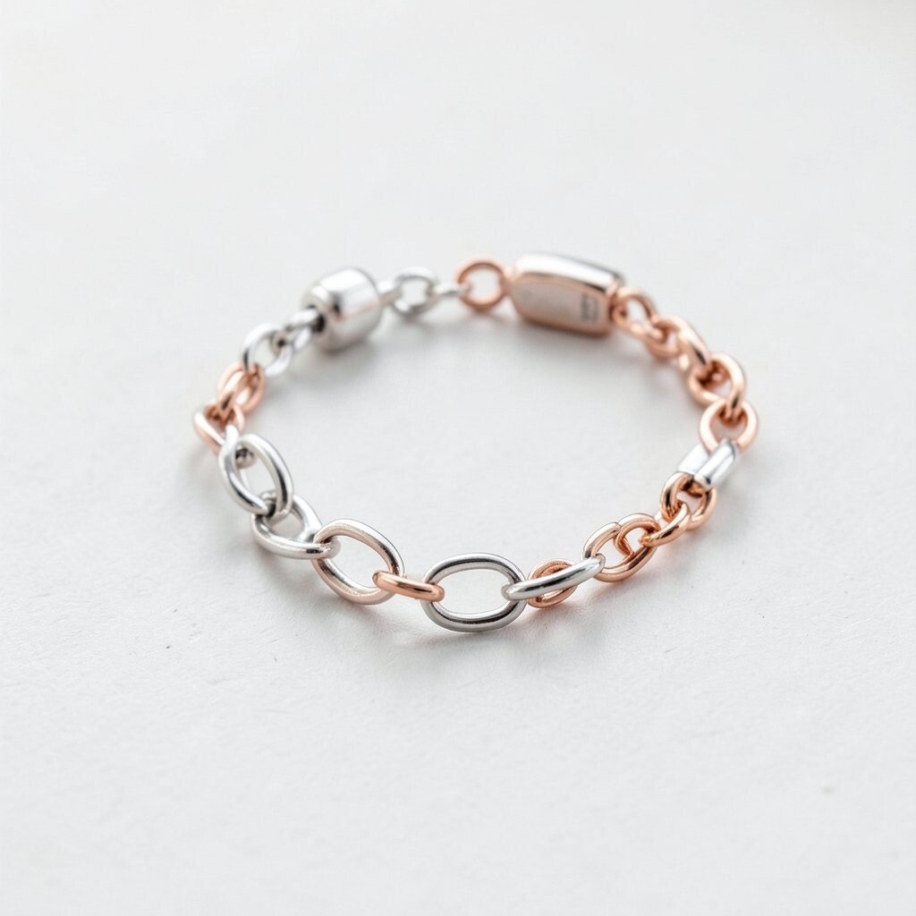 The cool, sleek look of steel contrasts beautifully with the warmth of gold. This pairing is often seen in modern bracelets and bold rings.