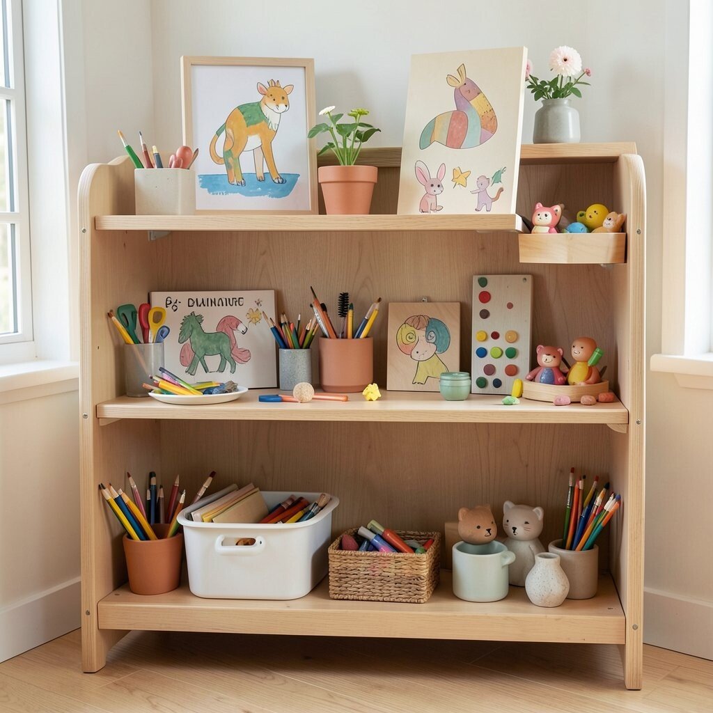 Rotate the displayed pieces regularly to keep the gallery fresh. Add small art supplies like crayons and paper in a nearby basket. Consider using a shelf with adjustable height to accommodate growing artists.