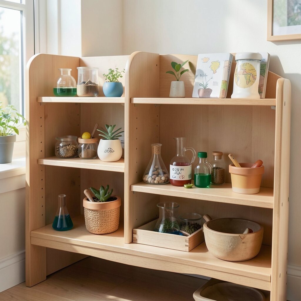 Curate a science exploration shelf with magnifying glasses and specimen jars. Add a telescope or microscope for deeper investigation.