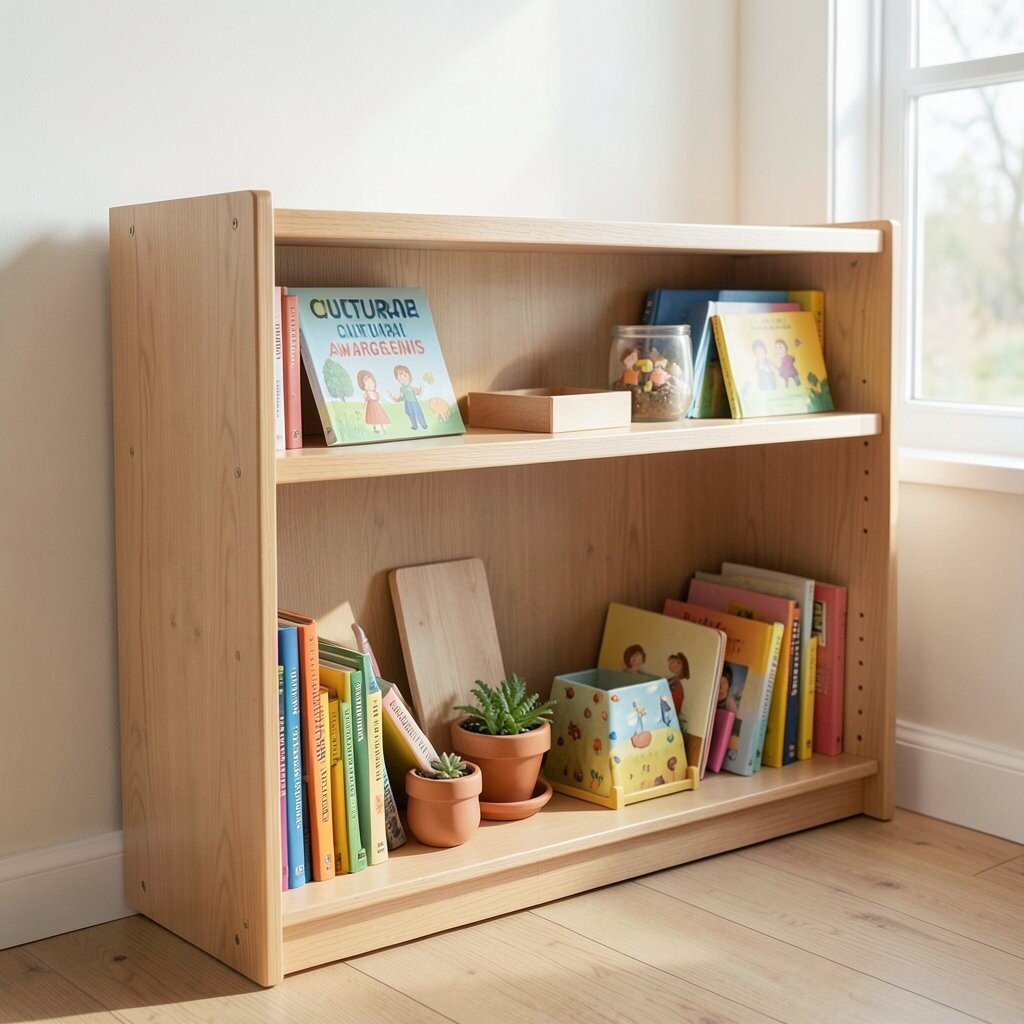 Personalize it with family photos from various trips. Rotate the items to spotlight different cultures each month. This shelf fosters empathy and inclusivity.