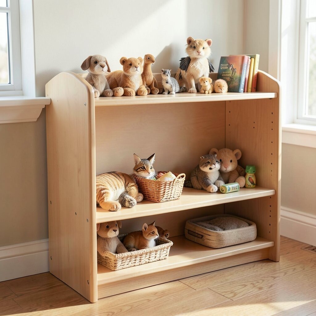 Create an animal kingdom shelf with plush toys and animal figurines. Include books about wildlife and habitats.
