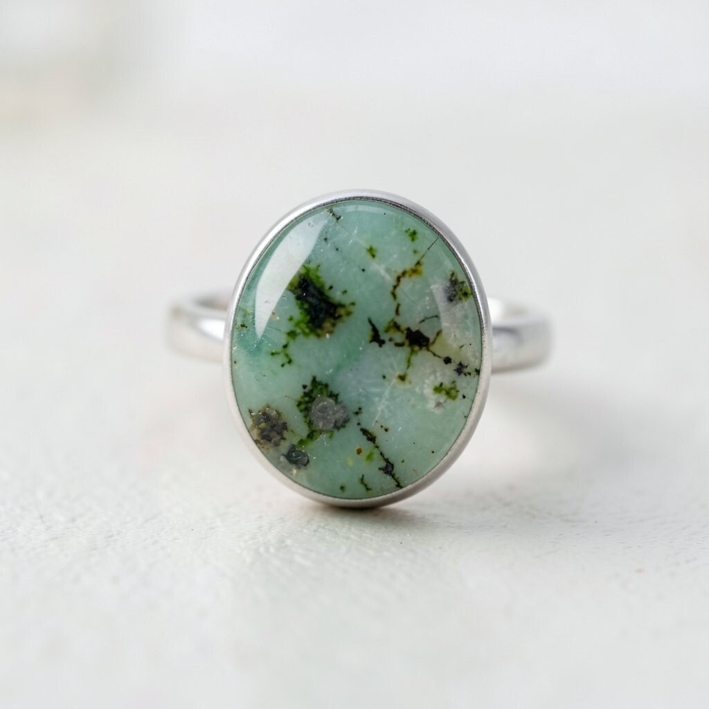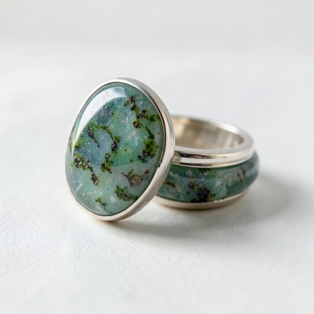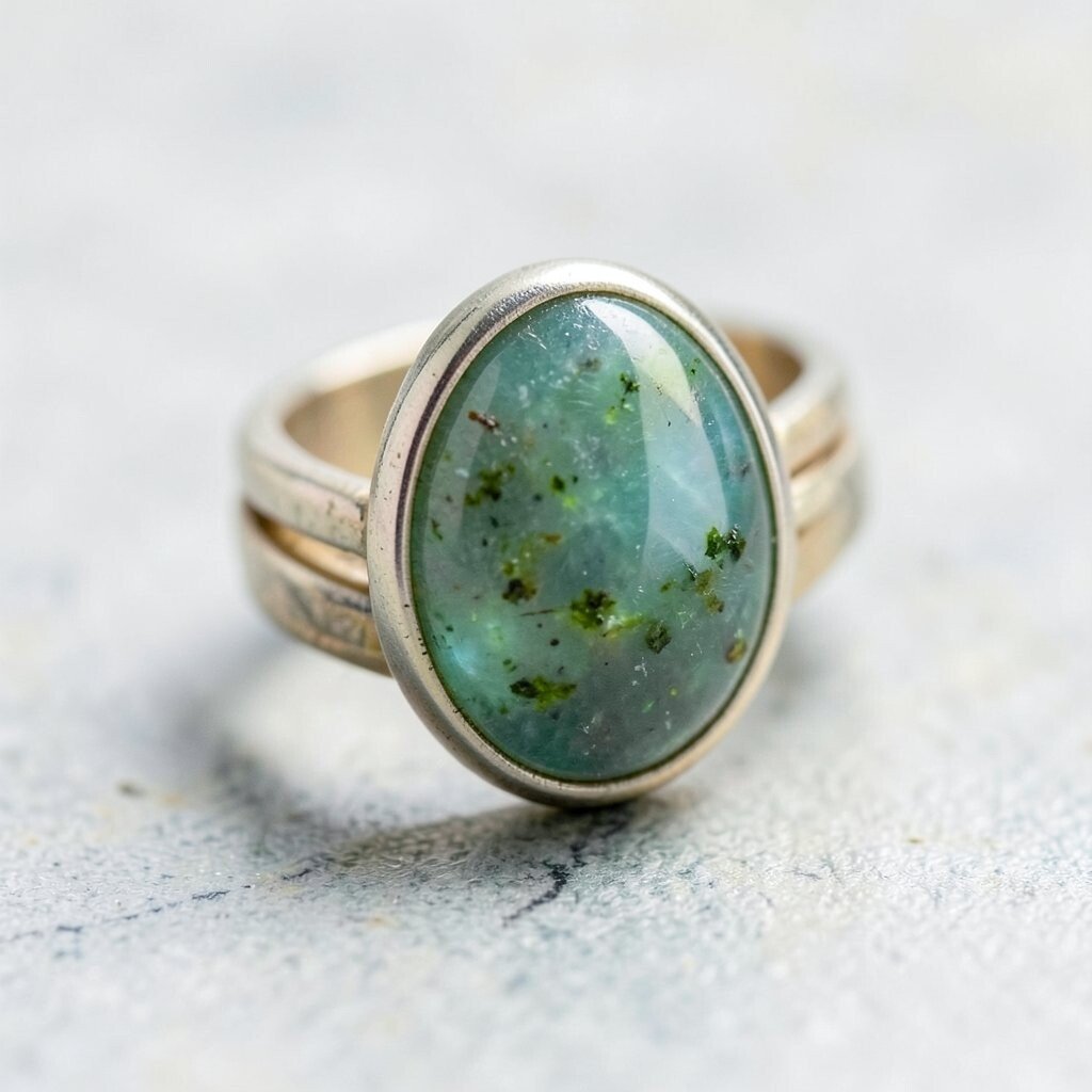 The classic silver band elevates the natural beauty of moss agate. Its simplicity complements the stone’s intricate patterns.