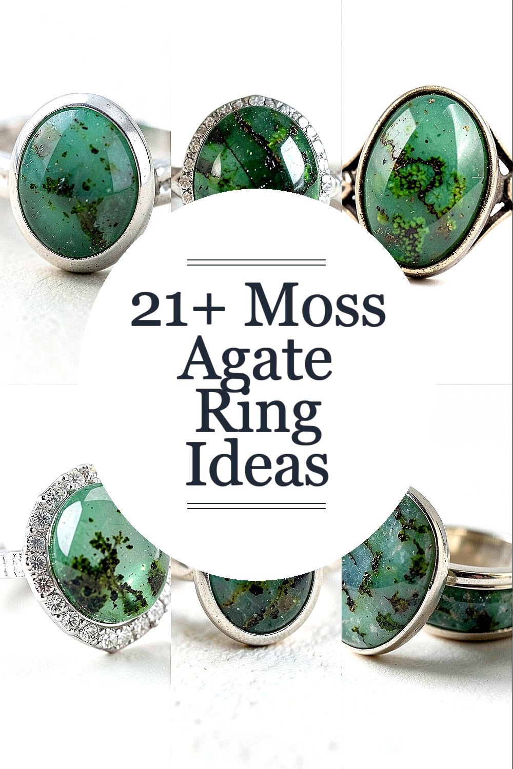 Geometric shapes bring a modern edge to moss agate rings. The angular designs highlight the stone’s organic patterns.