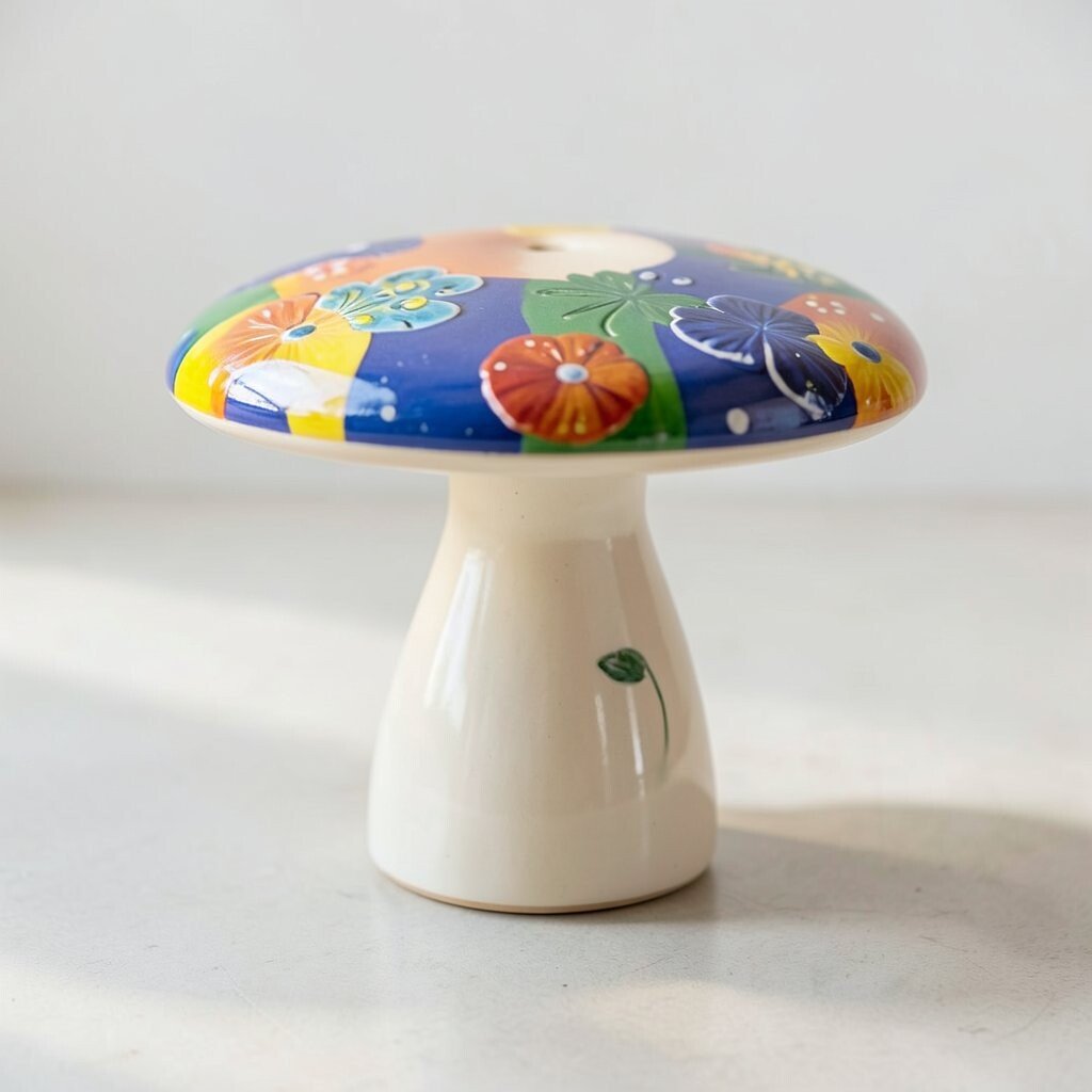 Brighten up your space with a ceramic mushroom table painted in vivid colors. These tables are like pieces of art.
