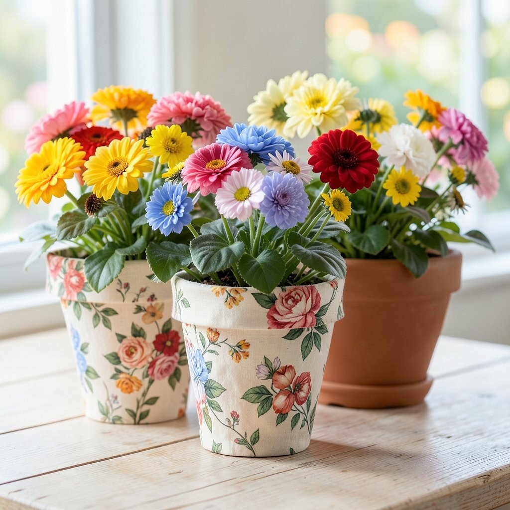 Give your plain flower pots a new lease on life with colorful fabric. Choose bright, floral prints that mimic the beauty of nature. It’s easy and makes your plants pop!