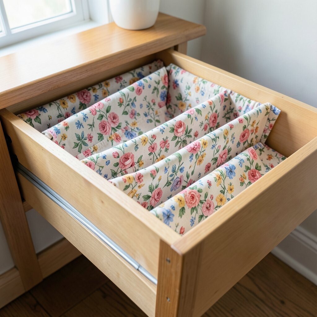 Line your drawers with fabric for a splash of surprise every time you open them. Use scented fabric for a fresh aroma. It’s like a secret garden in your dresser!