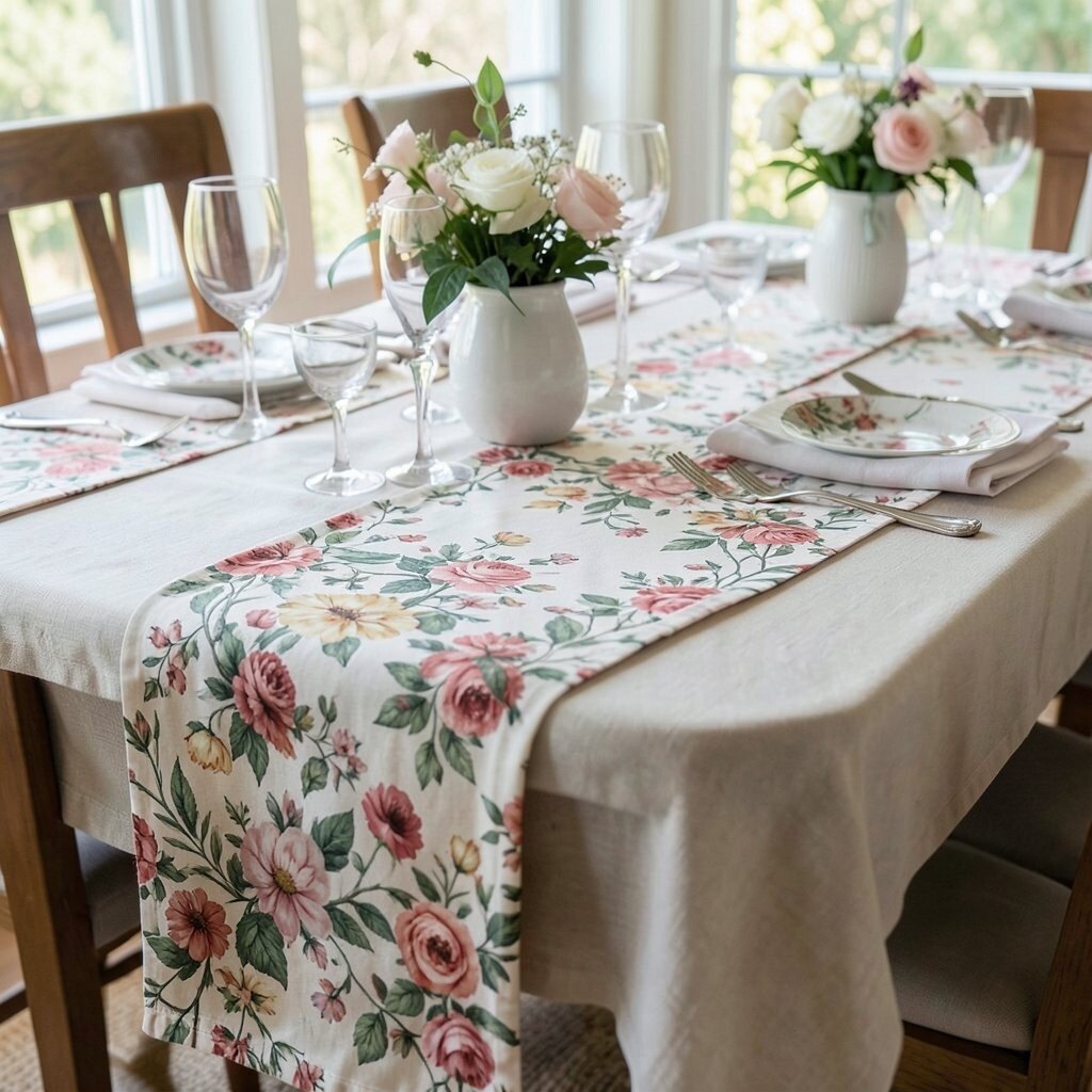 Dress up your dining table with a fabric table runner. Choose a theme that suits your decor. It’s a quick way to add elegance to mealtime.