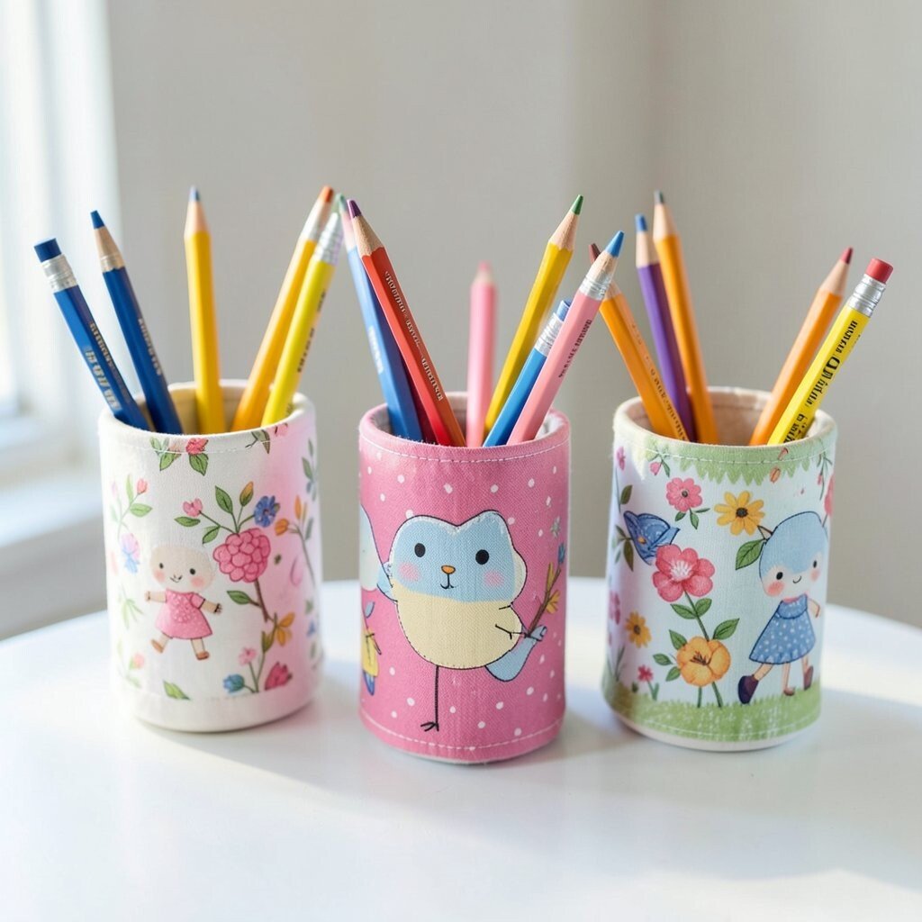 Cover tin cans with fabric for a cheerful pencil holder. Organizes your desk and looks cute doing it. Use fun prints for a pop of color.