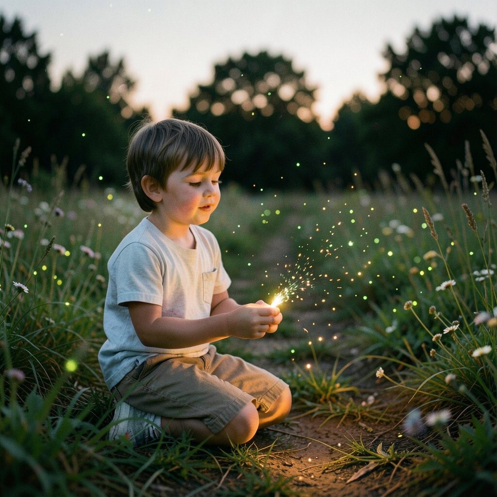 When the sky turned deep blue, tiny lights began blinking in the grass. The yard felt quiet and full of wonder at the same time.