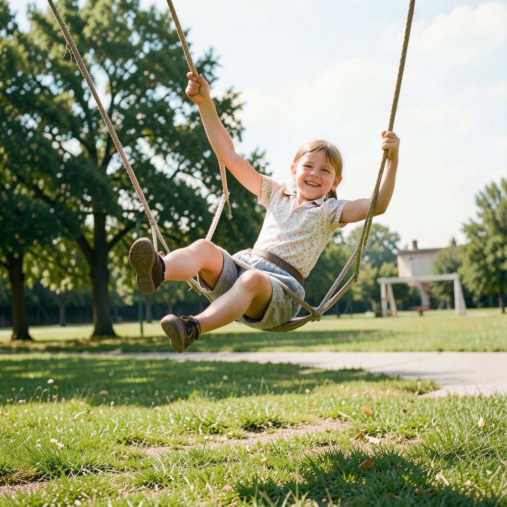 The sky looked closer from the swing set. Each push sent the body flying for a second, and that brief lift felt thrilling.