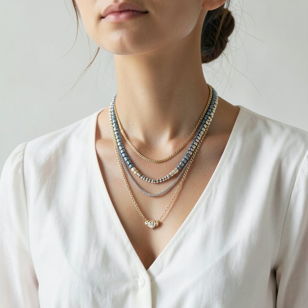 Layered necklaces add depth and interest to your neckline. Mix different lengths and styles for a personalized look.