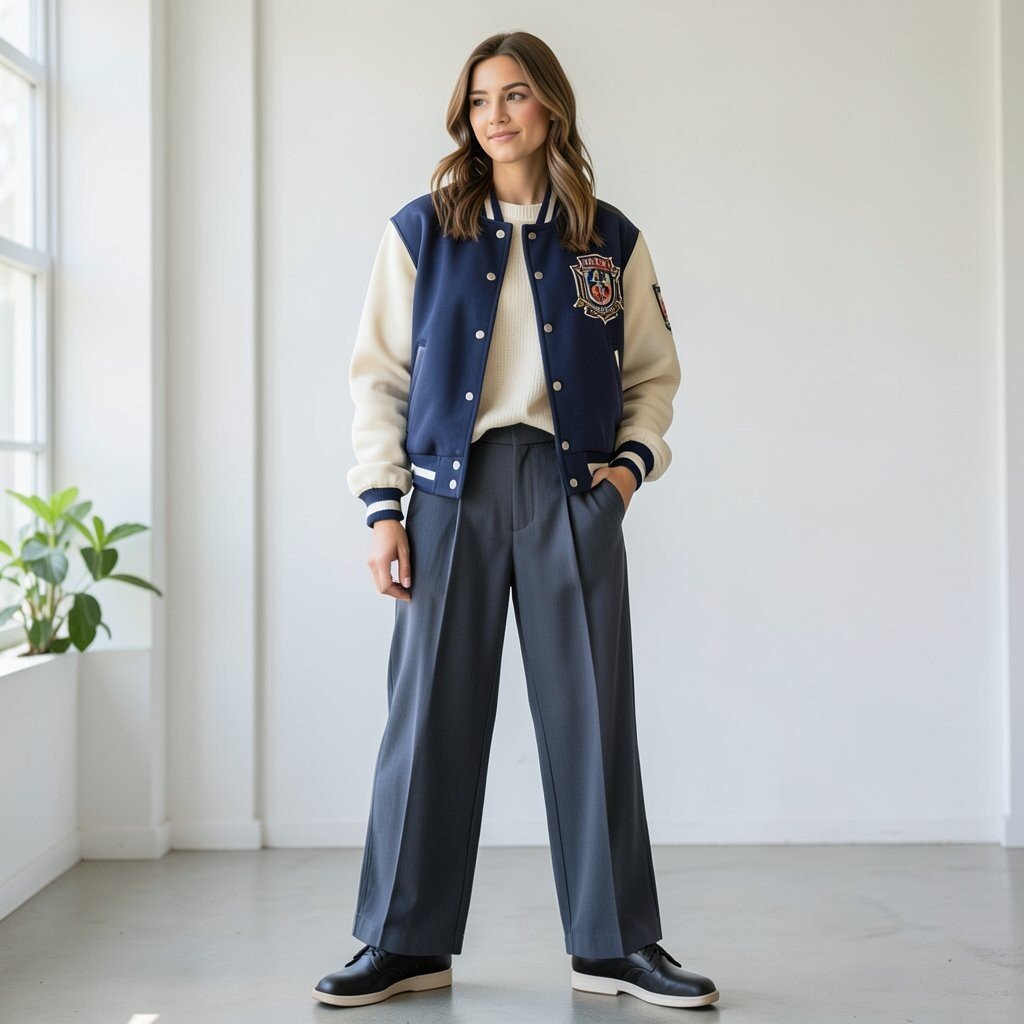 A varsity jacket gives a sporty, youthful feel. Pleated pants make the outfit look sharper and more grown up.
