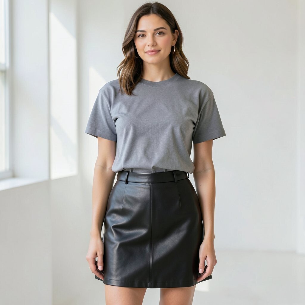 A boxy tee gives a loose, relaxed shape. A leather skirt adds edge and makes the outfit feel sharper.