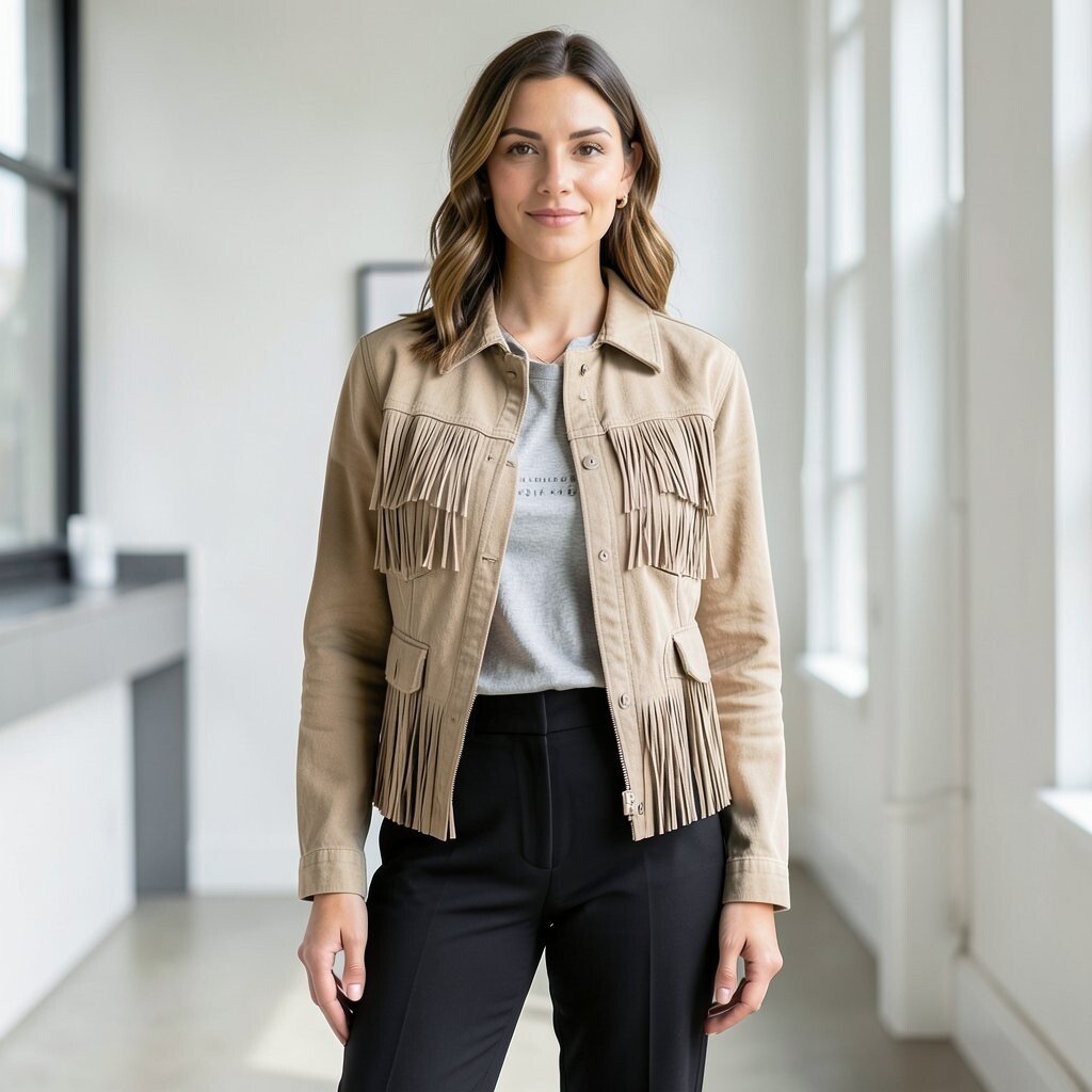 A fringe jacket brings motion and western flair. Black pants keep the outfit calm and balanced.