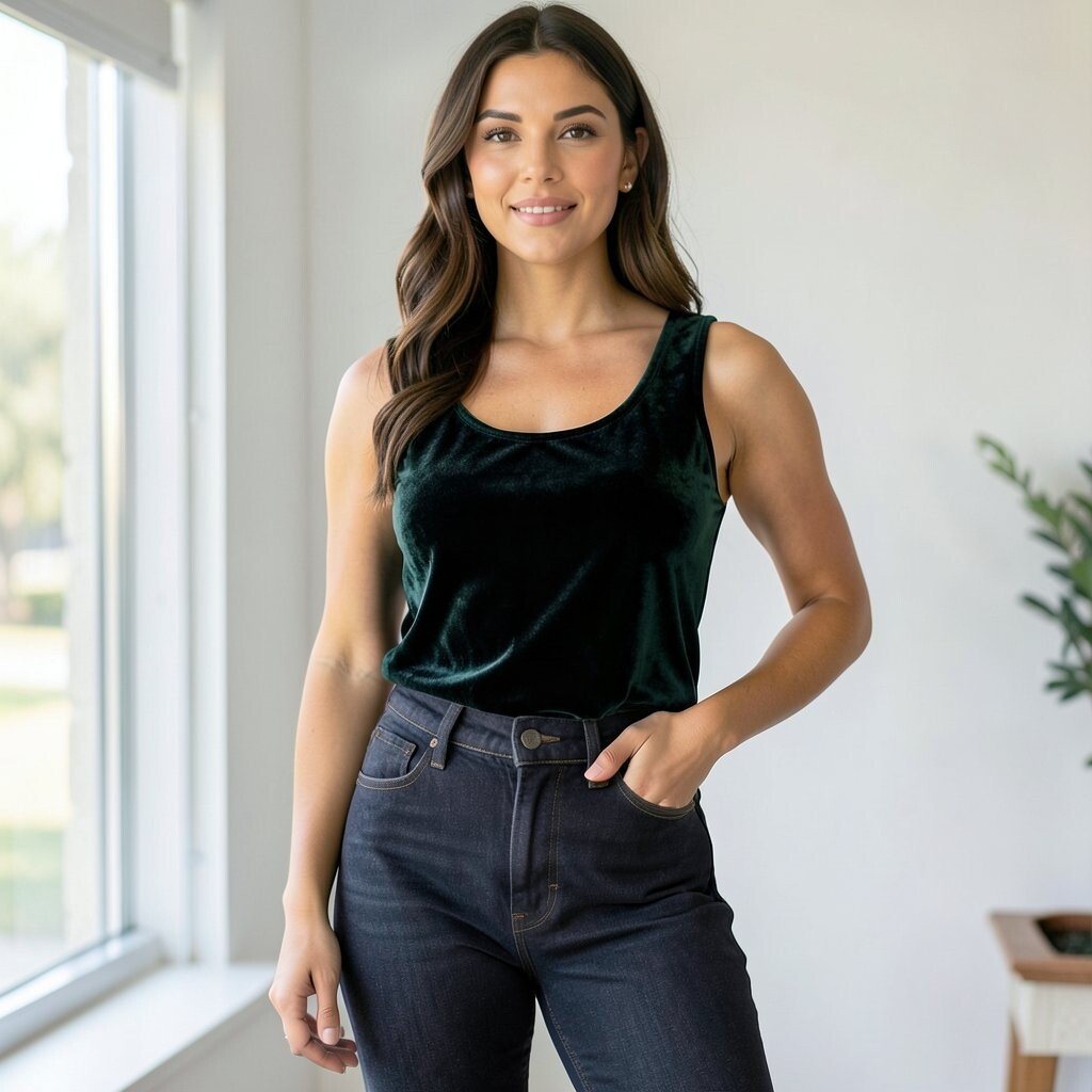 Deep colors like plum, emerald, and navy look especially good in velvet. If the fabric feels too costly, a velvet-touch top can still give the same mood. Dark jeans are also easy to rewear in many different ways.