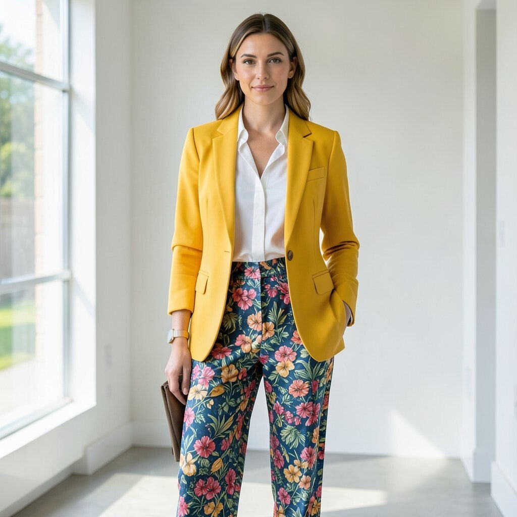 A bright blazer makes the outfit pop right away. Printed trousers add movement, color, and a lot of personality.