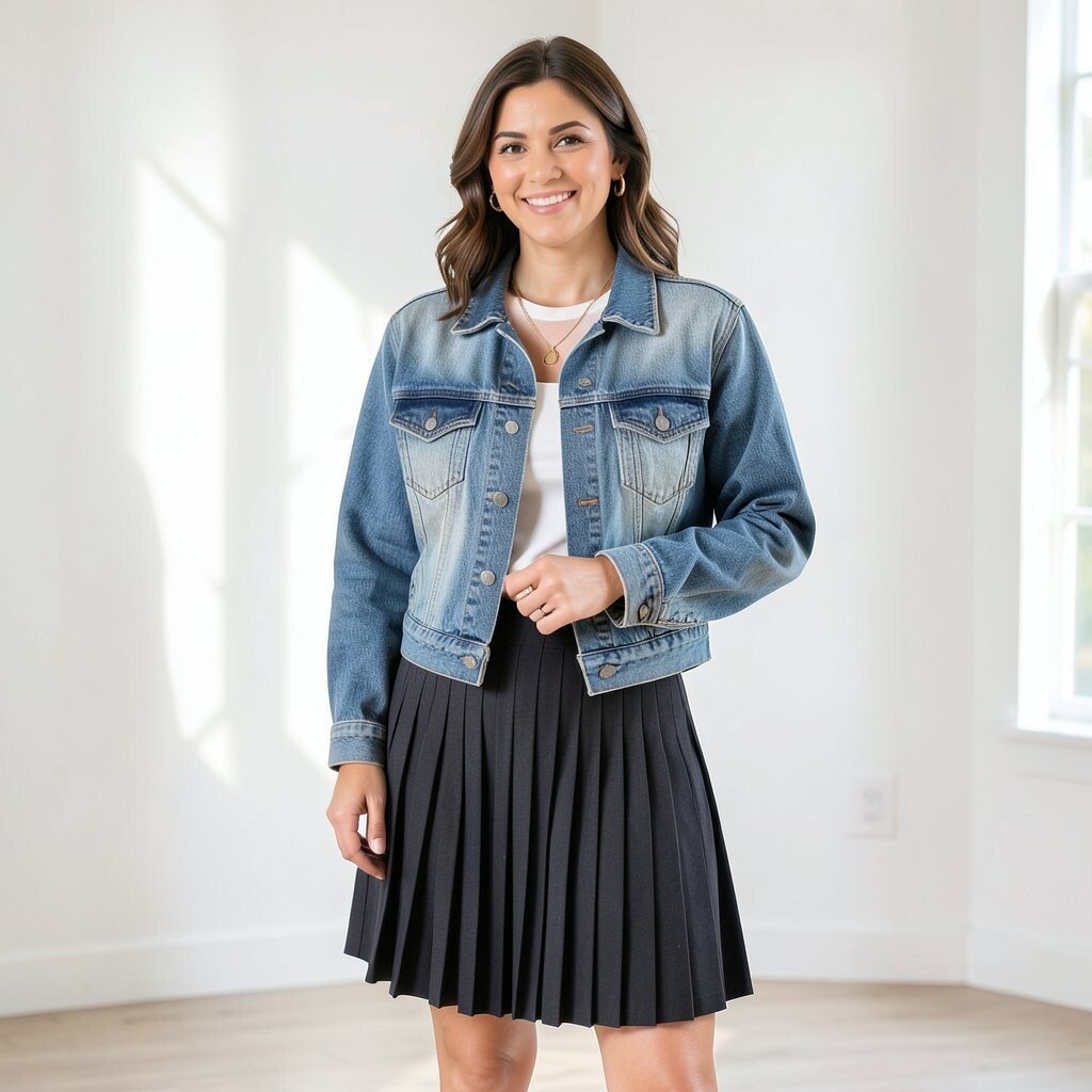 4. Denim Jacket with Pleated Skirt
