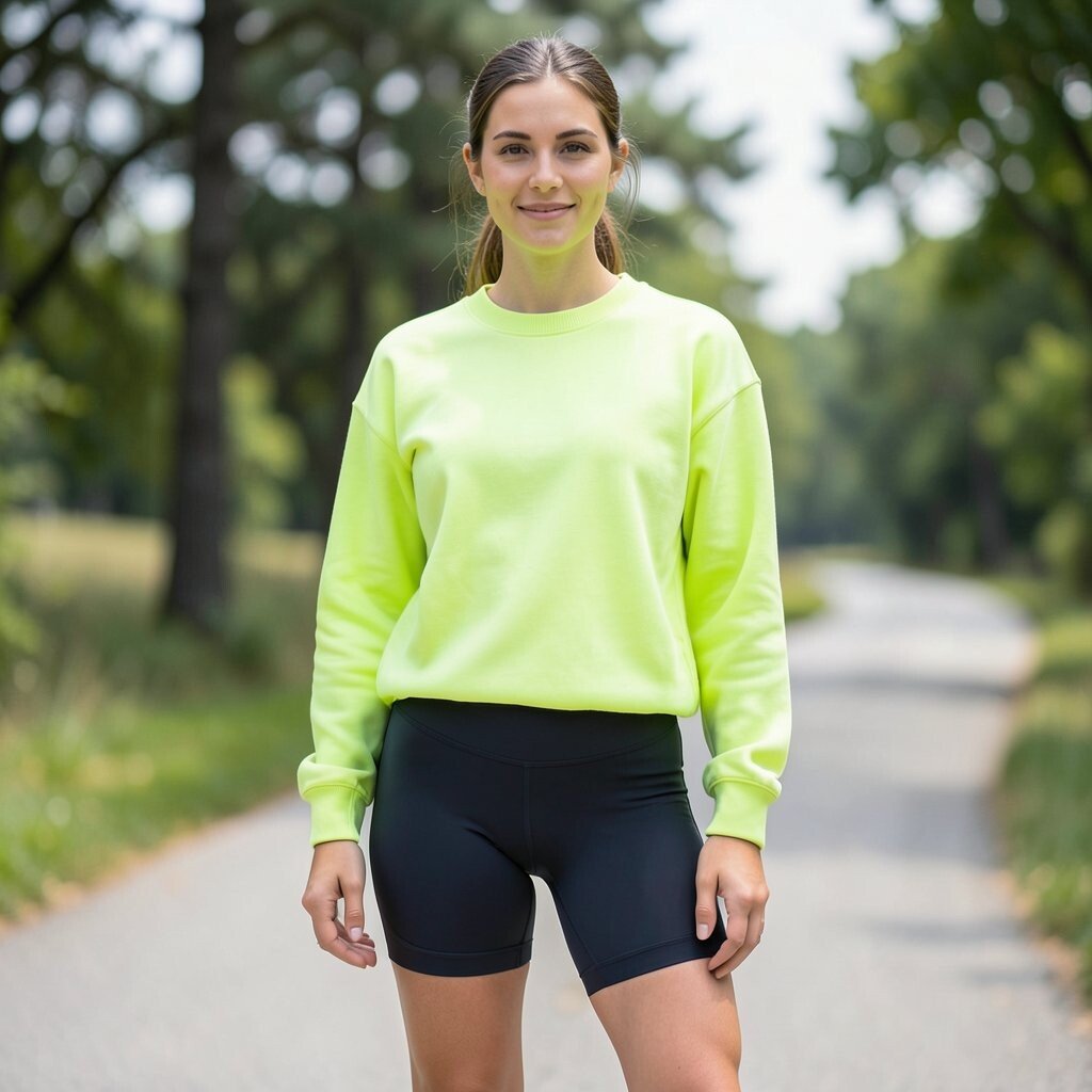 This style works well for errands, coffee runs, or casual hangouts. Neon shades feel very current again, so the look fits right into today’s street style. If you want a lower-cost version, use a basic sweatshirt and one bold accessory.
