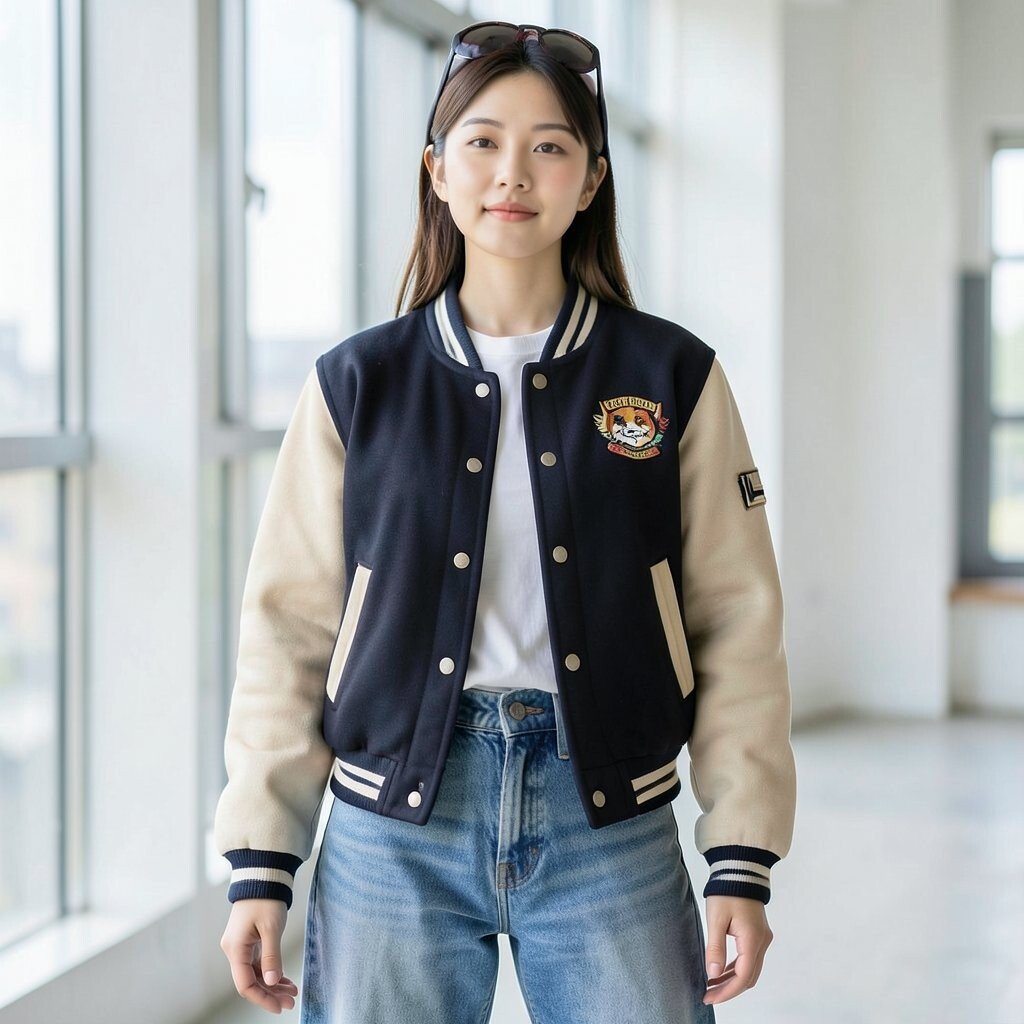 A varsity jacket with jeans gives a sporty and youthful Korean street look. The jacket adds color and personality, while the jeans keep the outfit grounded and easy.