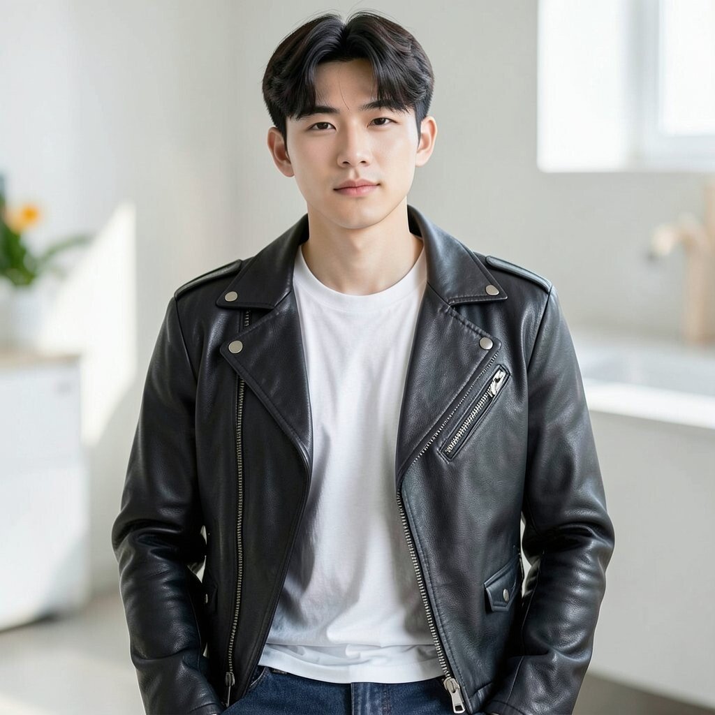 A leather jacket with a basic tee gives a cool and confident Korean-inspired look. The jacket adds edge, while the plain shirt keeps the outfit easy to wear.