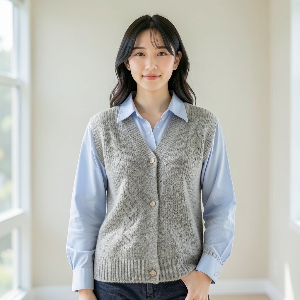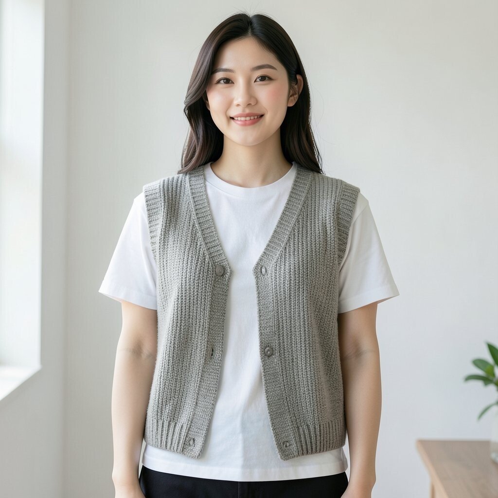 This look works well in mild weather and is easy on the budget. Choose a vest in beige, gray, or pastel shades, then pair it with jeans or a skirt for a sweet everyday outfit.
