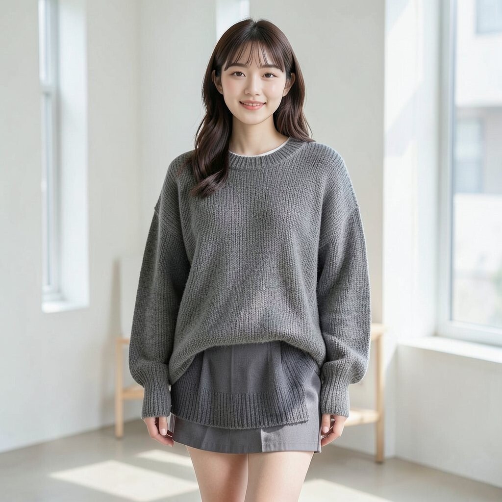 An oversized sweater with a mini skirt makes a cozy and cute outfit. The big sweater feels warm and soft, while the short skirt keeps the look light and youthful.