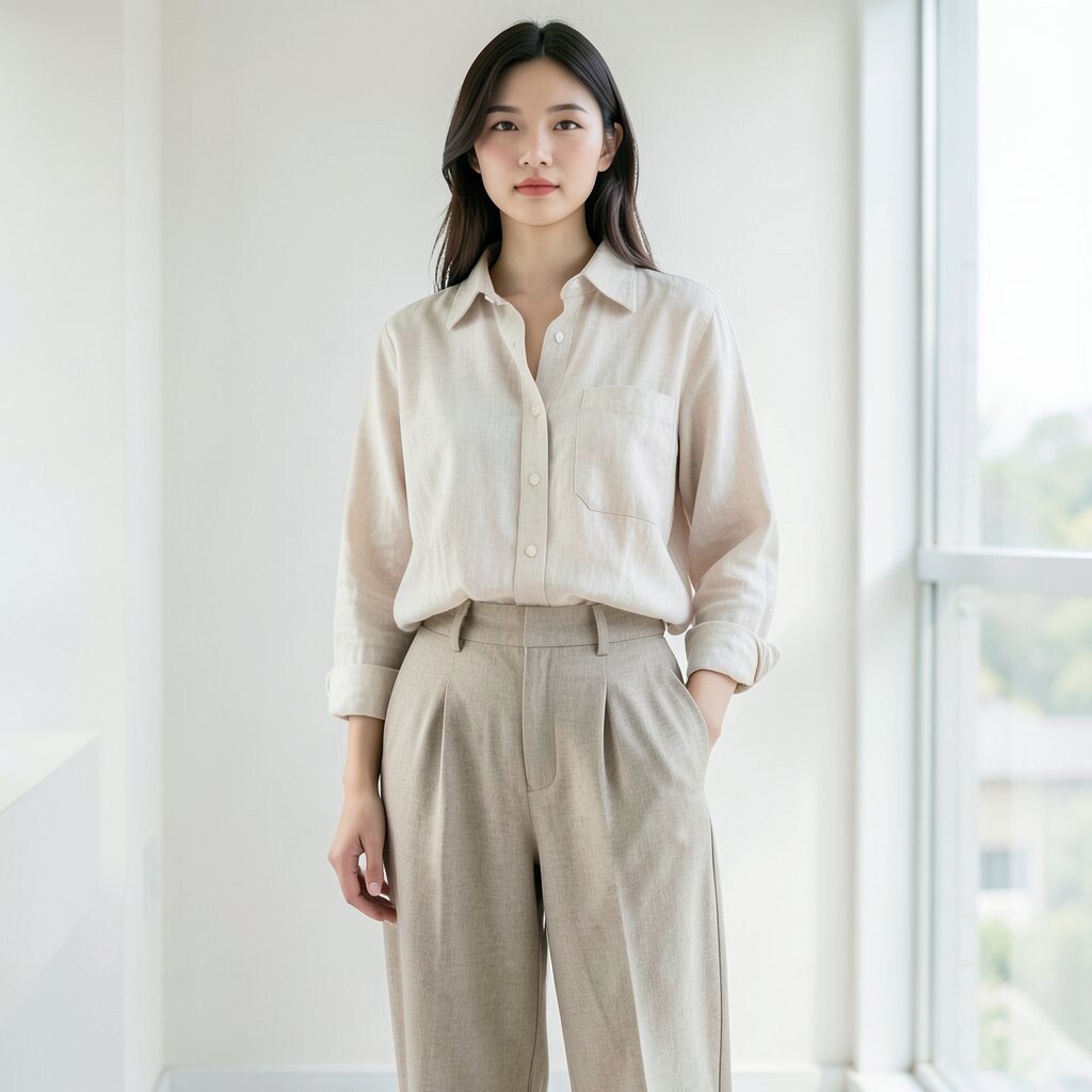 A linen shirt with relaxed trousers gives a calm and airy look that feels very Korean in warm weather. The fabric looks soft and natural, which makes the outfit feel easy and clean.