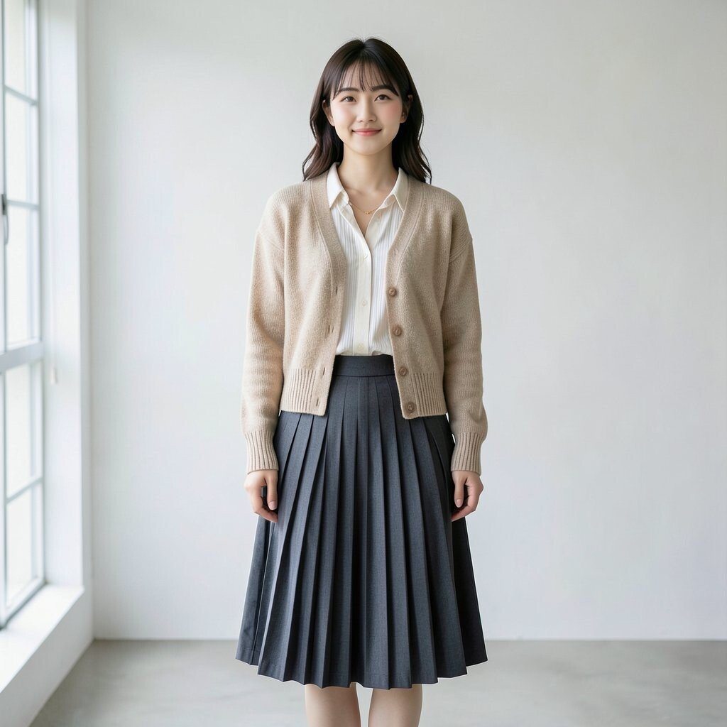 A pleated skirt with a cardigan gives a soft and neat school-inspired look. The skirt moves nicely when you walk, and the cardigan adds warmth and charm.