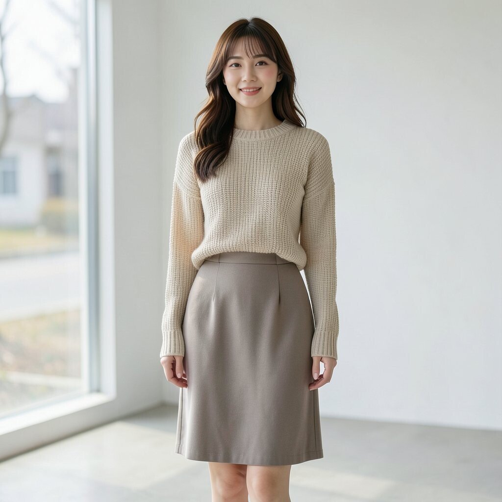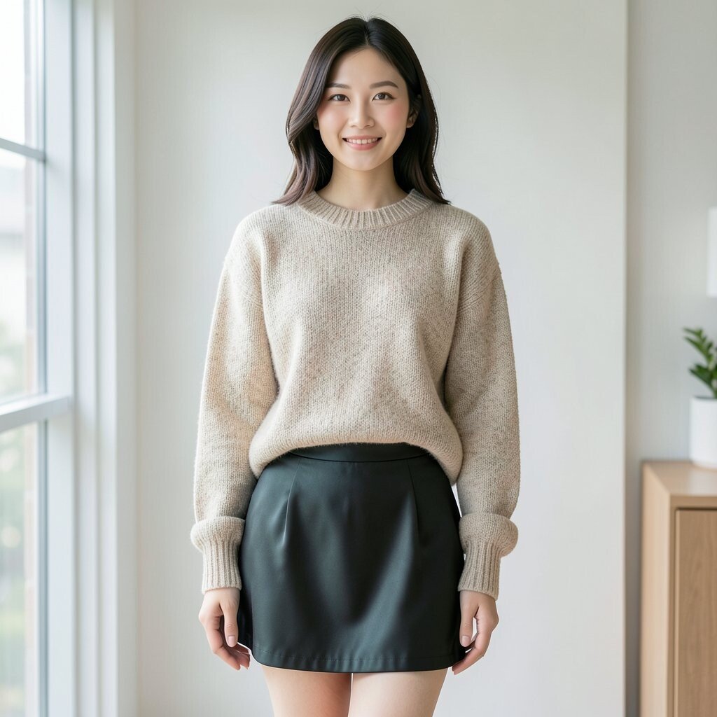 This outfit is great for dinner, events, or any day you want to feel a little more dressed up. A tucked-in sweater can show the skirt shape better, while a loose sweater gives a softer look.