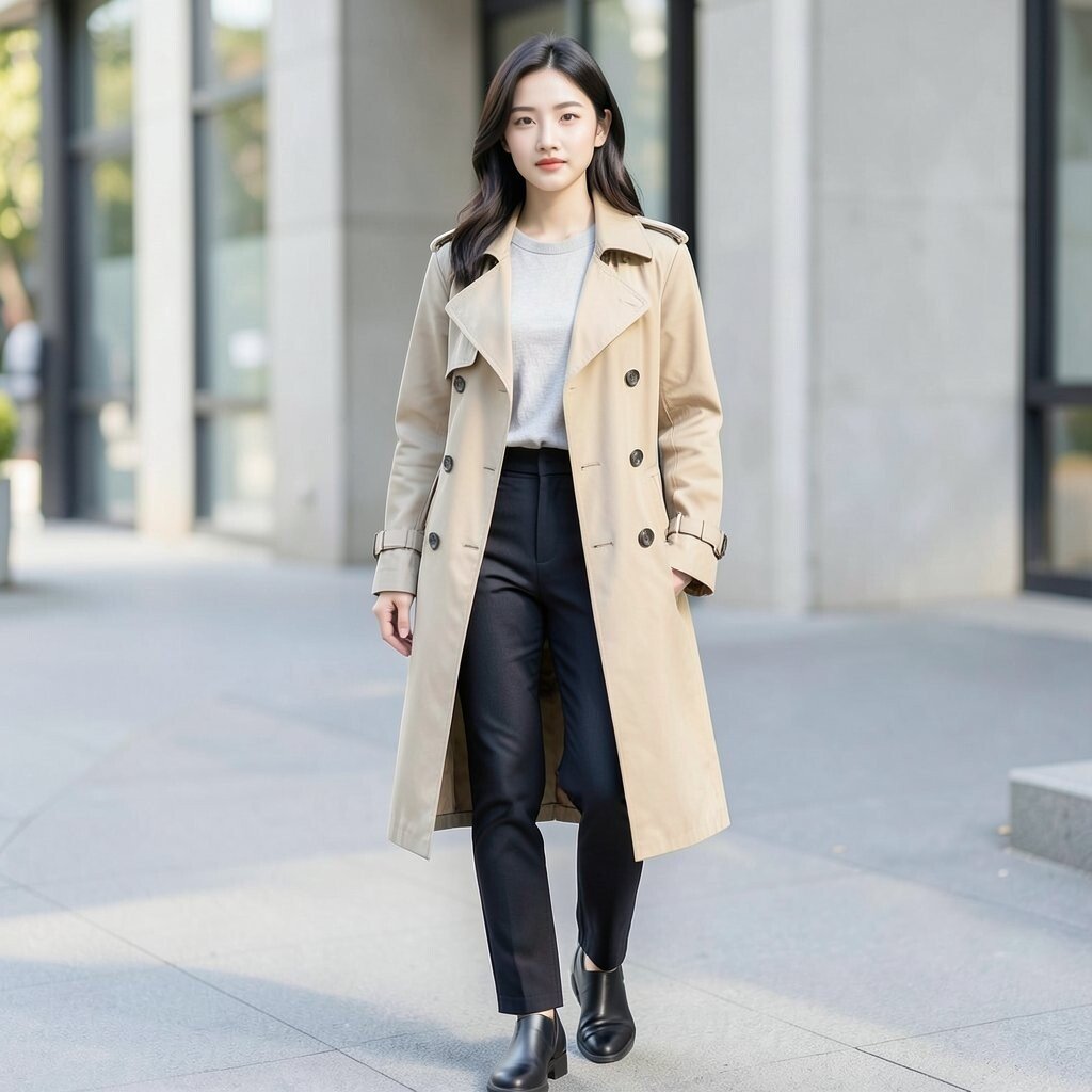 A trench coat with slim pants gives a clean and polished Korean city look. The coat adds movement and style, while the slim pants keep the shape neat.