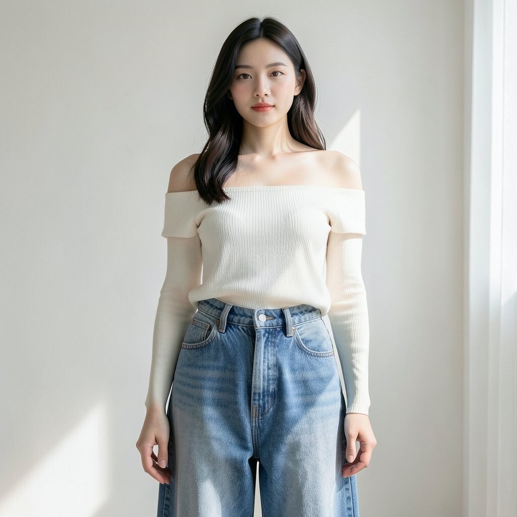 An off-shoulder top with wide jeans gives a soft and stylish Korean look. The open neckline feels pretty, and the wide jeans add balance and comfort.