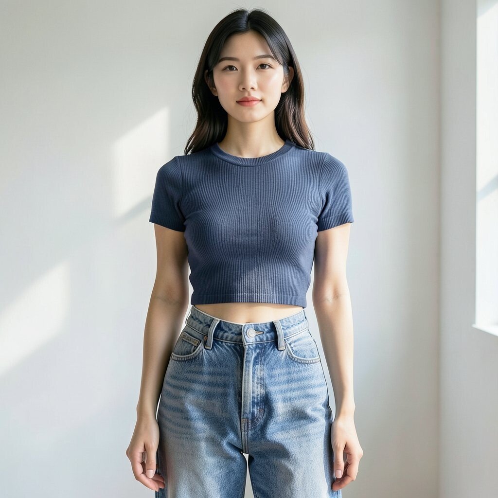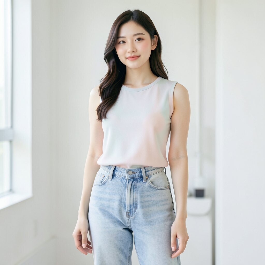 If you want a more personal feel, pick a top with puff sleeves, ribbed fabric, or a small collar. Light jeans help the whole outfit stay soft and simple.